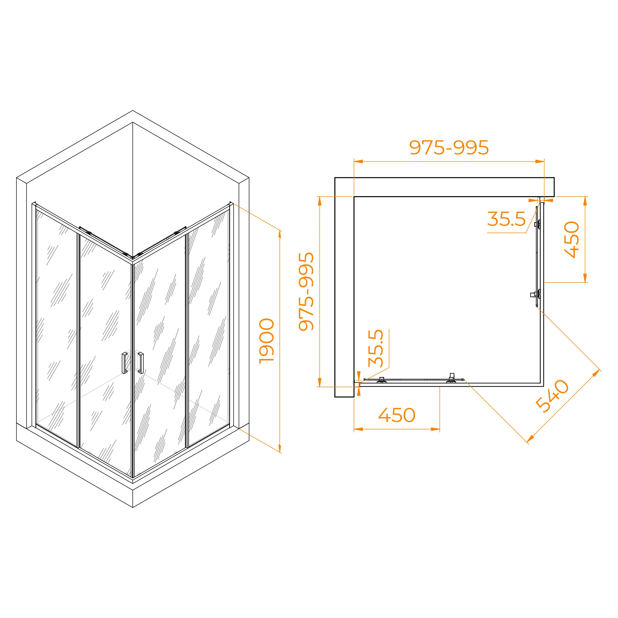 Высота душевого угла составляет 1900 мм, что позволяет использовать его для различных размеров ванных комнат. Двойные регулируемые ролики обеспечивают плавное и бесшумное открытие и закрытие дверей душевого уголка, что делает использование более комфортным и надежным. Конструкция дверей душевого уголка раздвижная, что делает его идеальным решением для небольших ванн, где не хватает места для открывания дверей наружу.