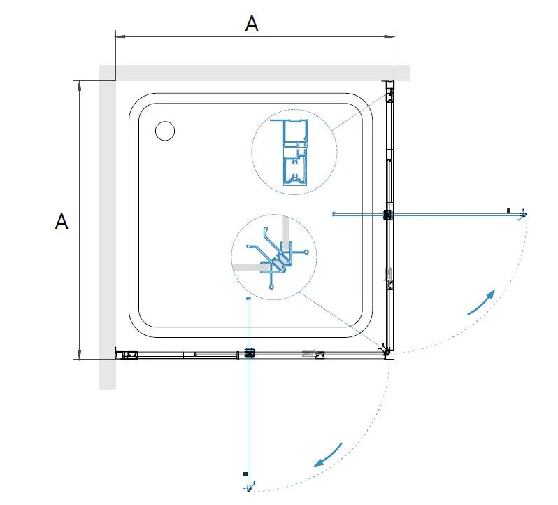 Высота данного уголка составляет 1950 мм, что обеспечивает комфортное использование для пользователей любого роста. Конструкция дверей распашные, что позволяет удобно заходить и выходить из душевого уголка.