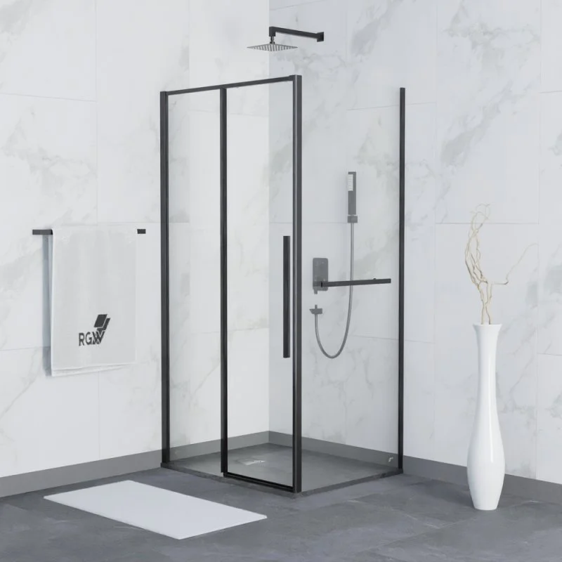 Профиль душевого уголка выполнен из анодированного алюминия, что гарантирует его высокую прочность и стойкость к коррозии. Черный цвет профиля придает уголку изысканный и элегантный вид, который с легкостью подойдет к любому интерьеру ванной комнаты.