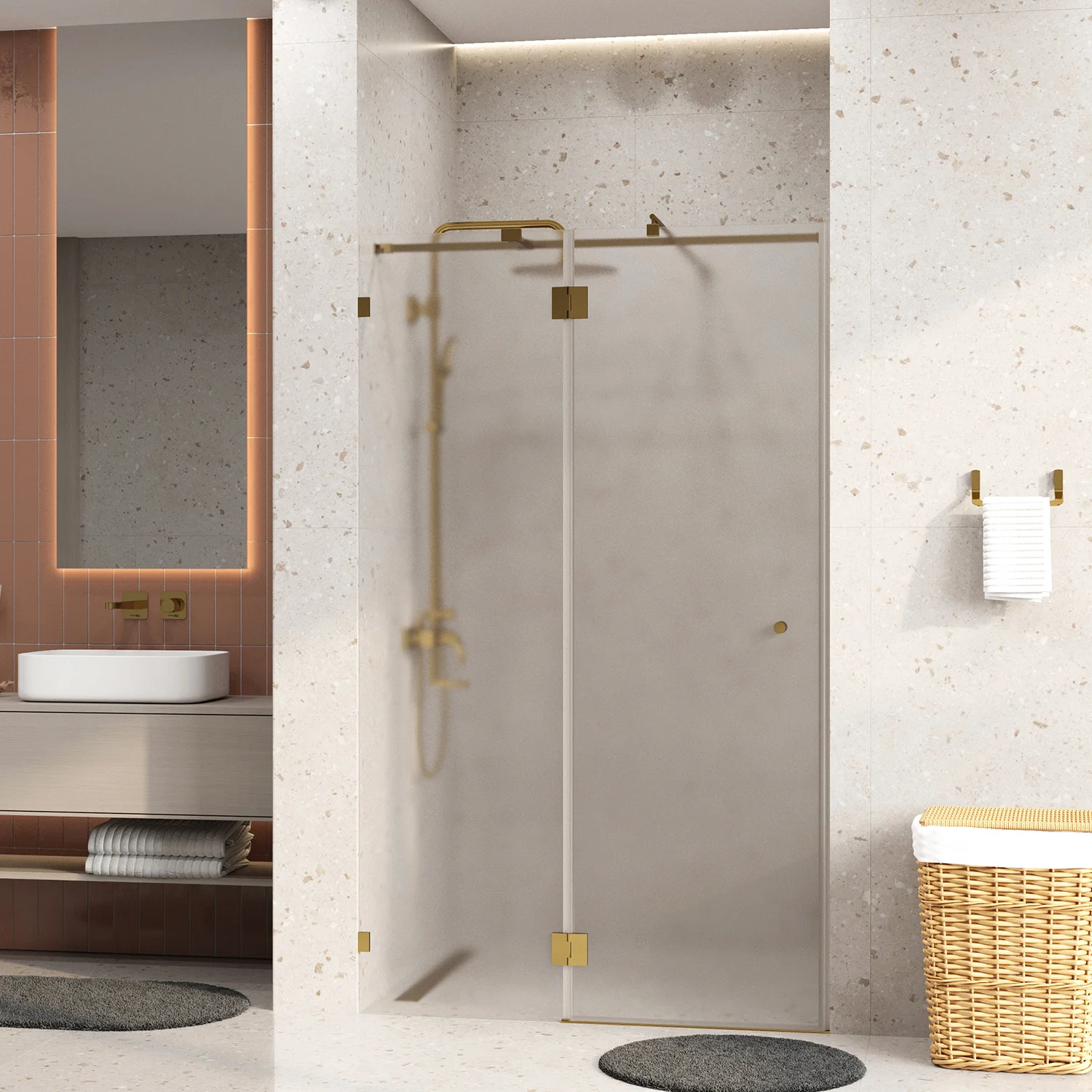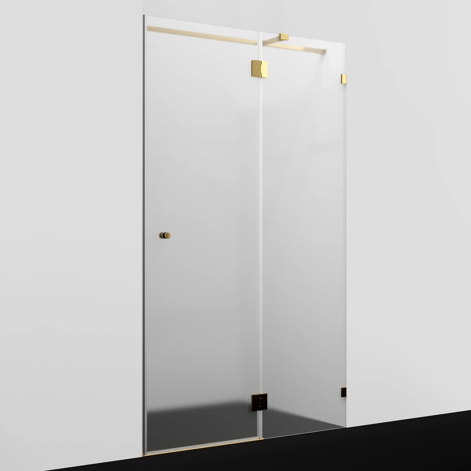 номинальный размер 1200x1000x2000, характеристики - закаленное стекло 8 мм, покрытие стекла WasserSchutz, распашной механизм на петлях из латуни, беспрофильное исполнение, крепление к стенефиксированными петлями из латуни, ручка нержавеющая сталь AISI304, силиконовый уплотнитель двери с магнитным замком, силиконовые уплотнители, комплект фурнируты, цвет фурнитуры: розовое золото, универсальная установка.