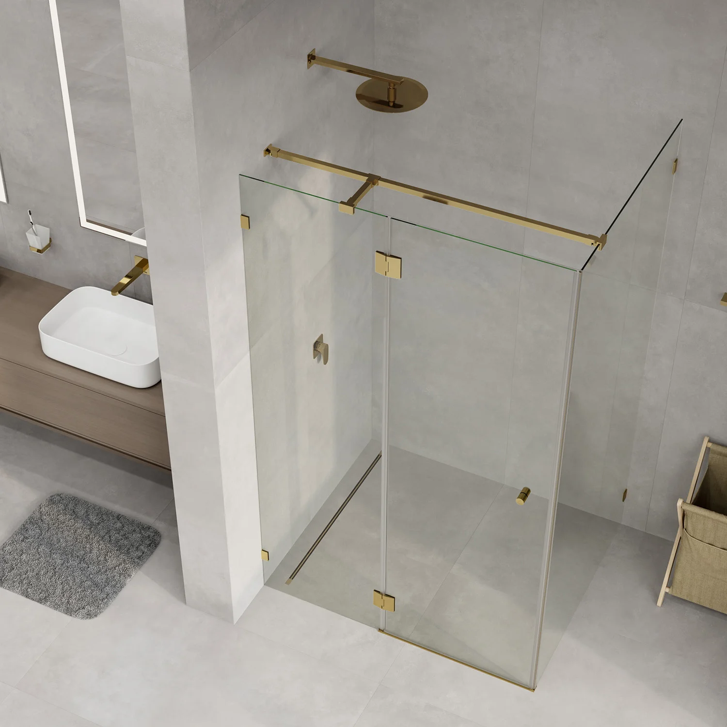 номинальный размер 1200x1000x2000, характеристики - закаленное стекло 8 мм, покрытие стекла WasserSchutz, распашной механизм на петлях из латуни, беспрофильное исполнение, крепление к стенефиксированными петлями из латуни, ручка нержавеющая сталь AISI304, силиконовый уплотнитель двери с магнитным замком, силиконовые уплотнители, комплект фурнируты, цвет фурнитуры: розовое золото, универсальная установка.