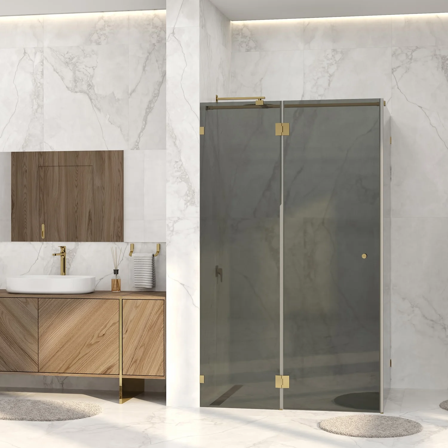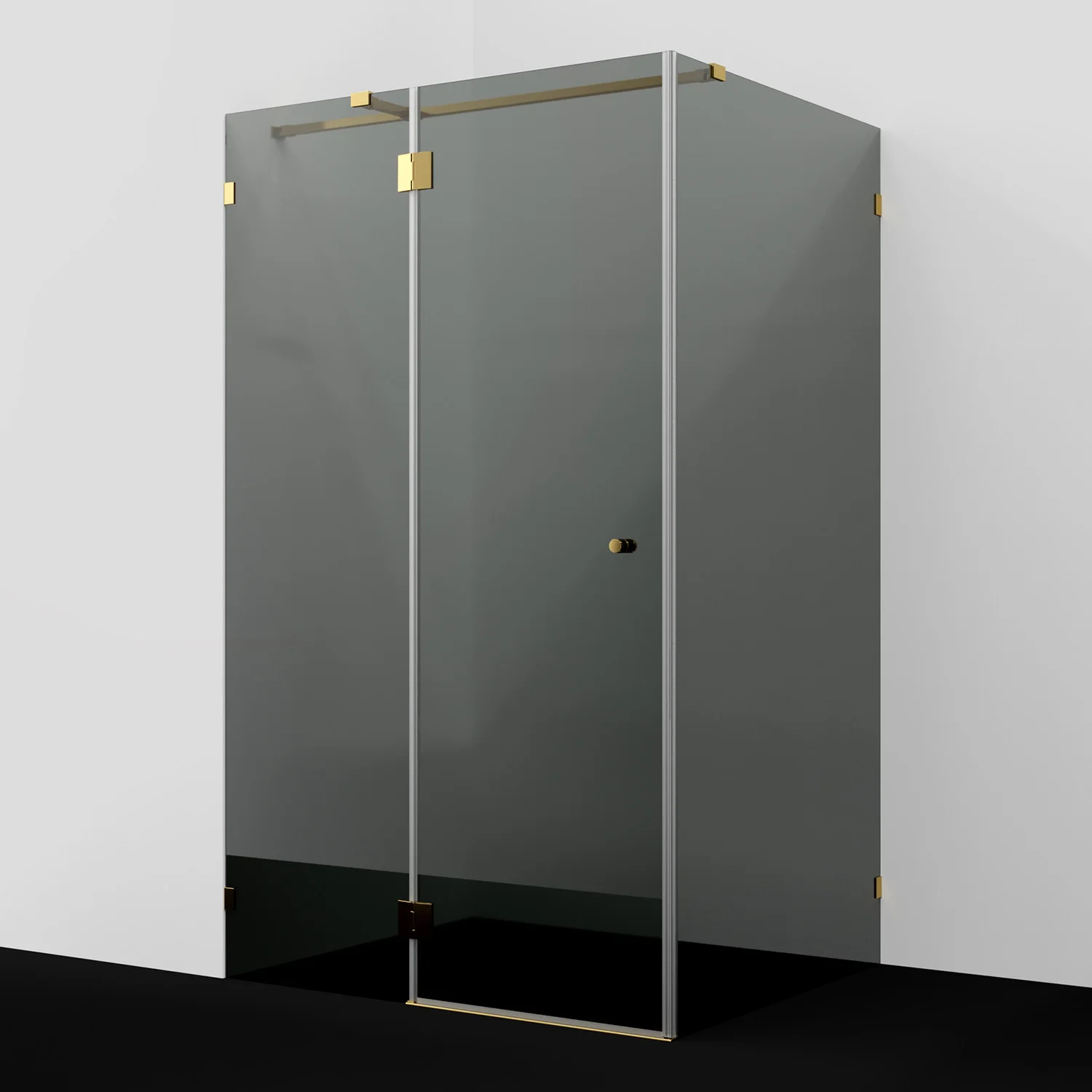 закаленное тонированное стекло 6 мм, покрытие стекла WasserSchutz, распашной механизм на петлях из латуни, беспрофильное исполнение, крепление к стене фиксированными петлями из латуни, ручка нержавеющая сталь AISI304, силиконовый уплотнитель двери с магнитным замком, силиконовые уплотнители, комплект фурнируты, цвет фурнитуры: глянцевое золото, универсальная установка
