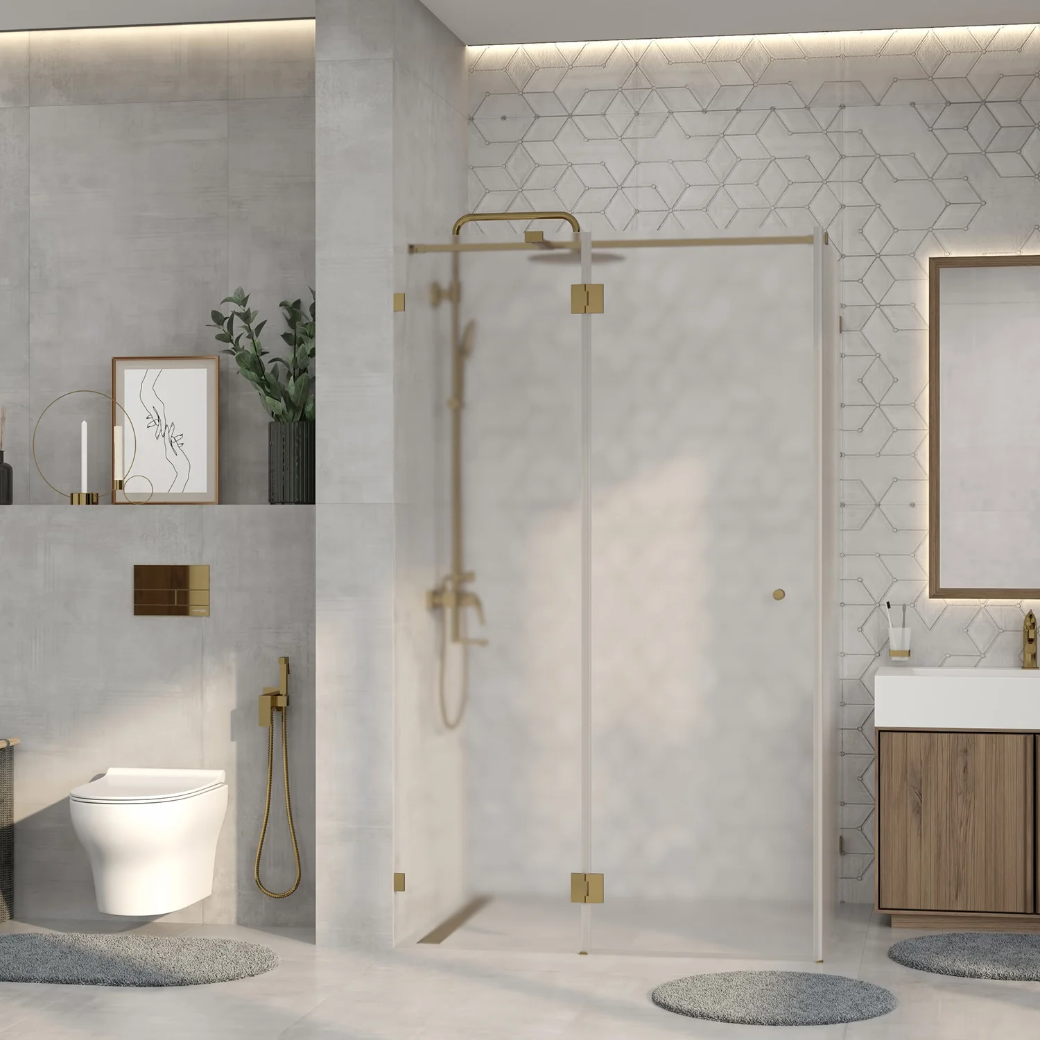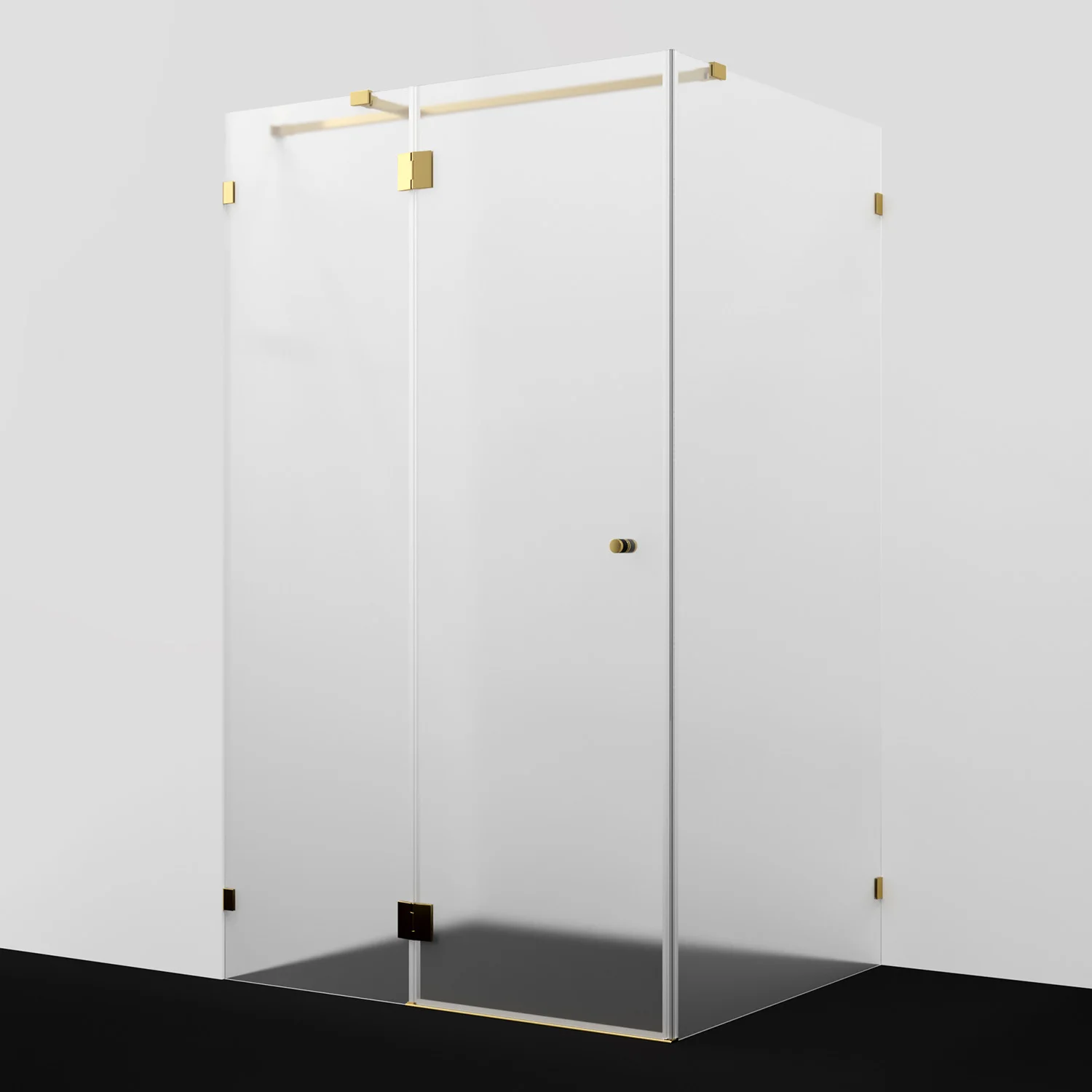 номинальный размер 1200x1000x2000, характеристики - закаленное стекло 8 мм, покрытие стекла WasserSchutz, распашной механизм на петлях из латуни, беспрофильное исполнение, крепление к стенефиксированными петлями из латуни, ручка нержавеющая сталь AISI304, силиконовый уплотнитель двери с магнитным замком, силиконовые уплотнители, комплект фурнируты, цвет фурнитуры: розовое золото, универсальная установка.