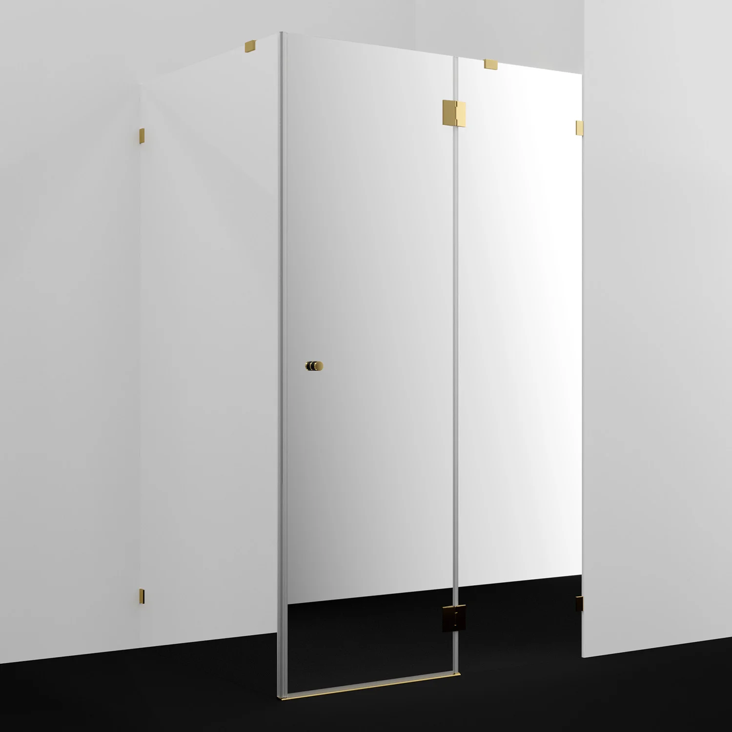 номинальный размер 1200x1000x2000, характеристики - закаленное стекло 8 мм, покрытие стекла WasserSchutz, распашной механизм на петлях из латуни, беспрофильное исполнение, крепление к стенефиксированными петлями из латуни, ручка нержавеющая сталь AISI304, силиконовый уплотнитель двери с магнитным замком, силиконовые уплотнители, комплект фурнируты, цвет фурнитуры: розовое золото, универсальная установка.