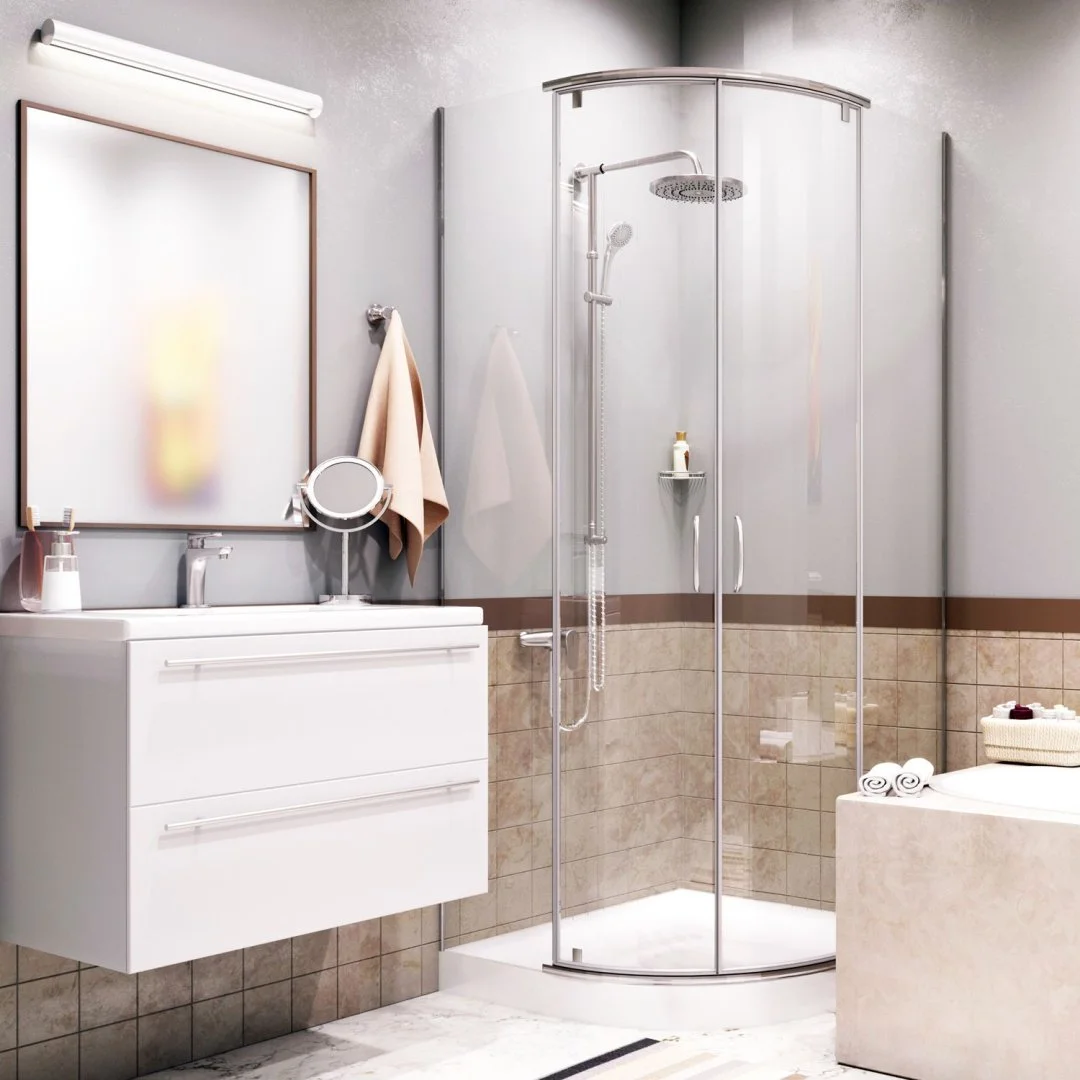 Закаленное прозрачное стекло 6 мм, Покрытие стекла WasserSchutz, Распашной механизм из латуни , Анодированный алюминиевый профиль 30 мм , Ручки дверей из сплава металлов, Регулирующий профиль до 15 мм, Силиконовый уплотнитель дверей с магнитным замком, Силиконовые уплотнители
