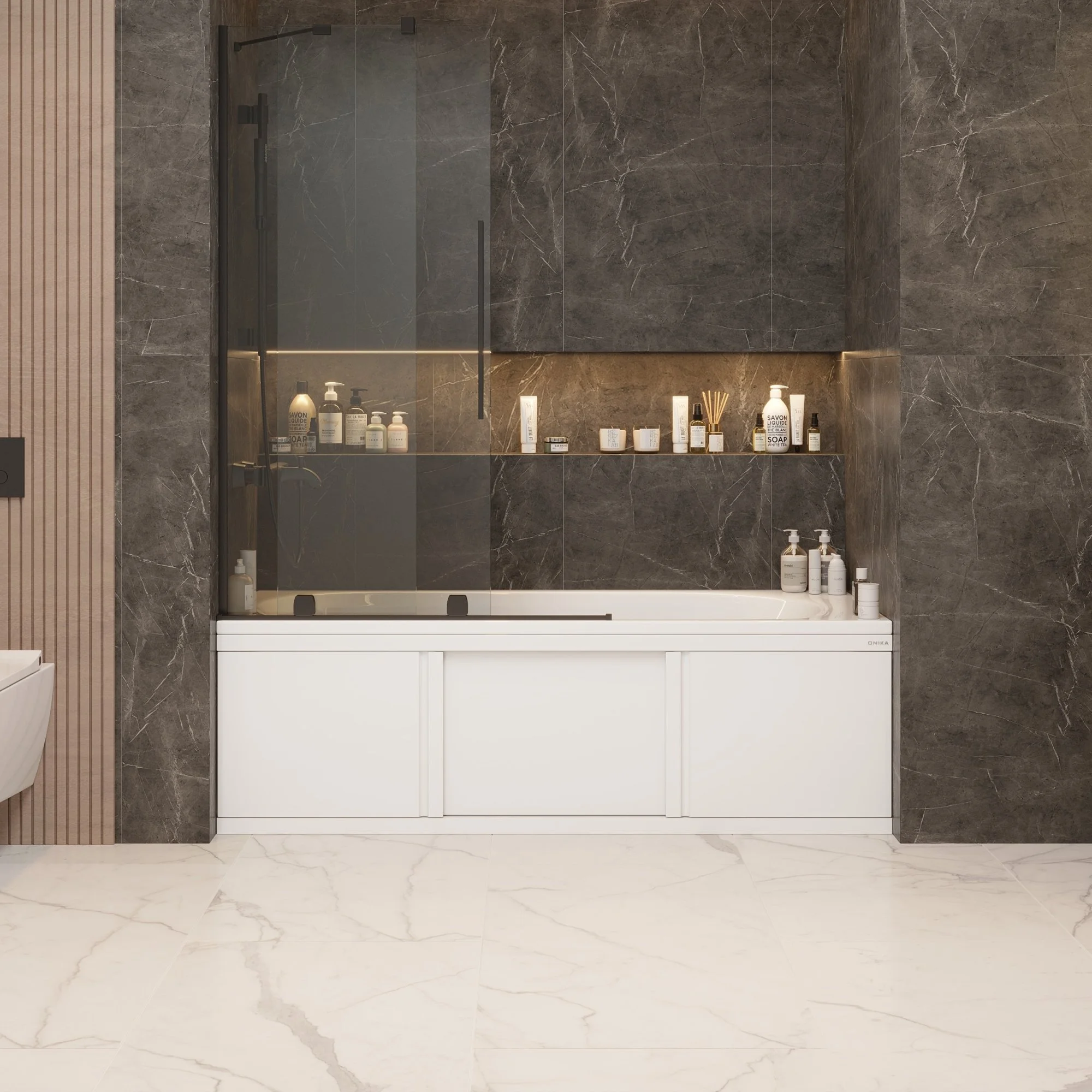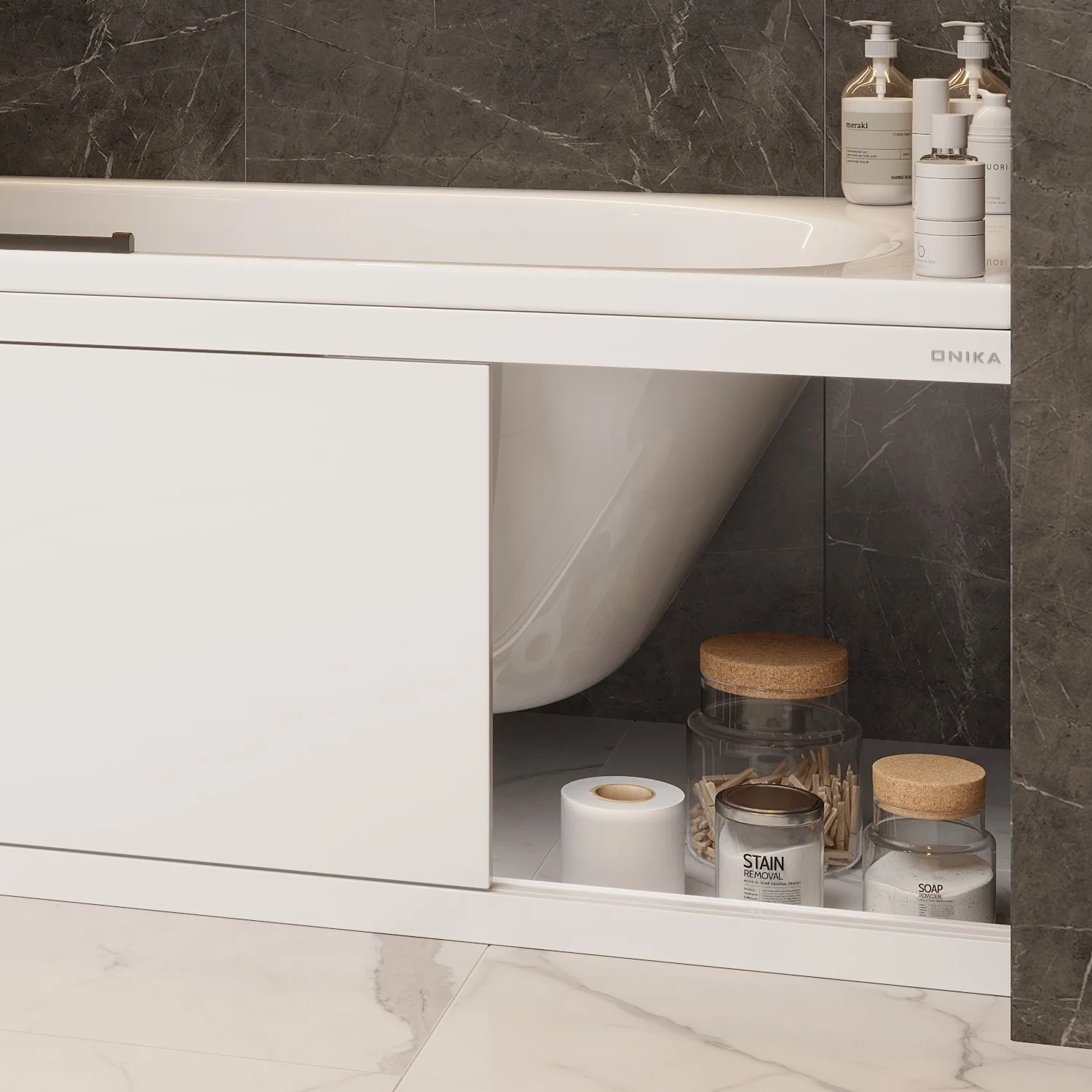 Экран Onika обладает повышенной износостойкостью, отлично переносит эксплуатацию в помещении с высокой влажностью и хорошо сочетается с любыми ваннами.