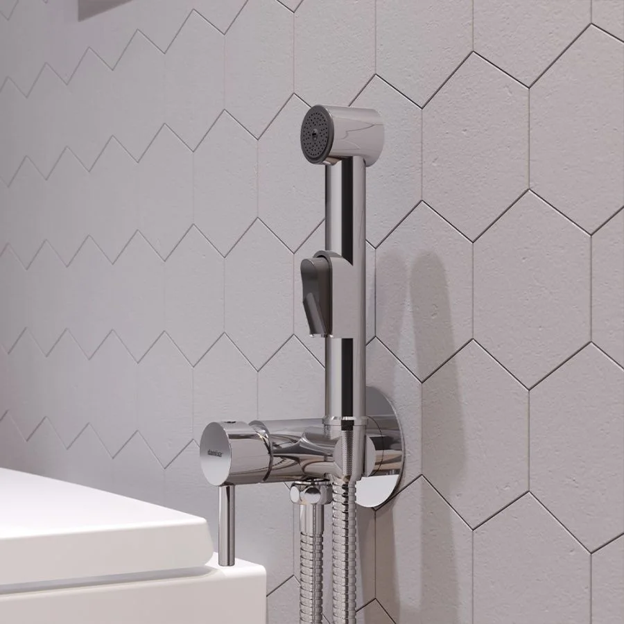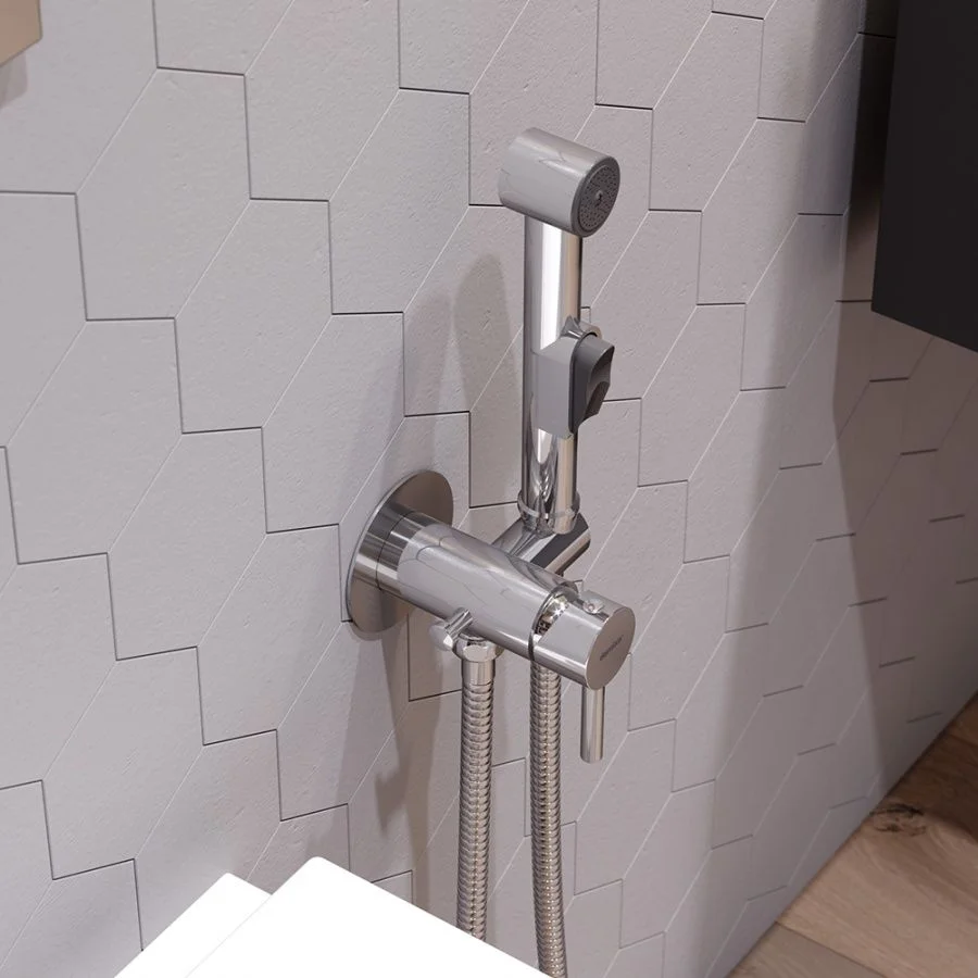 - Эстетика в функциональном обрамлении: компактный смеситель с настенной установкой экономит пространство стильная ручка-стик удобна в управлении крючок для аксессуаров на корпусе смесителя несет дополнительный функционал а гигиенический душ с держателем позаботится о полноценной чистоте.