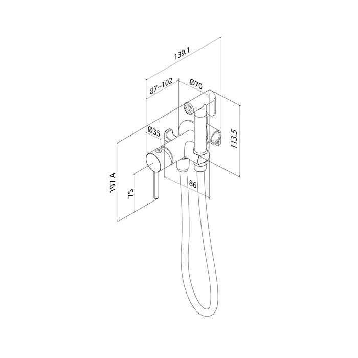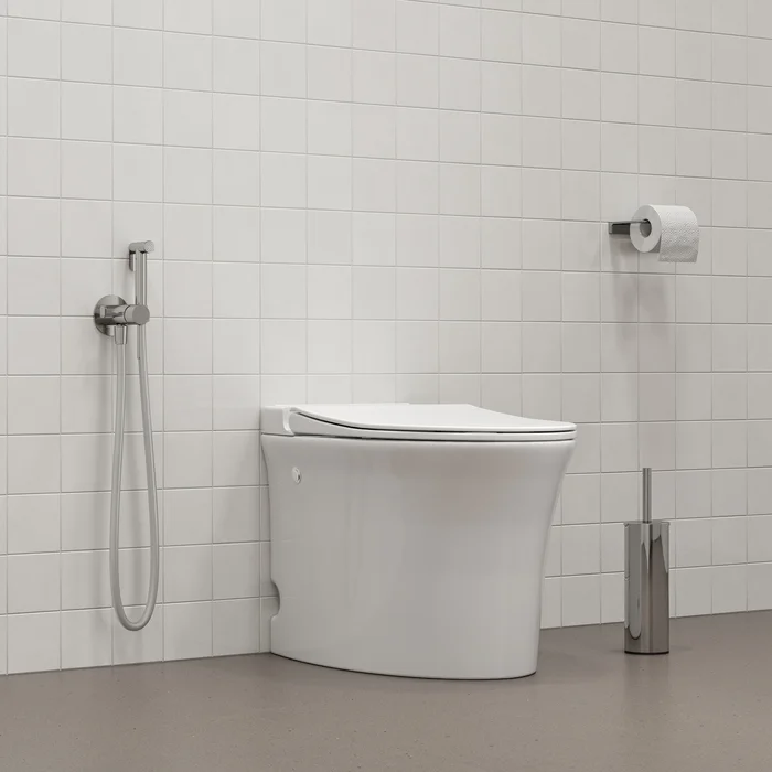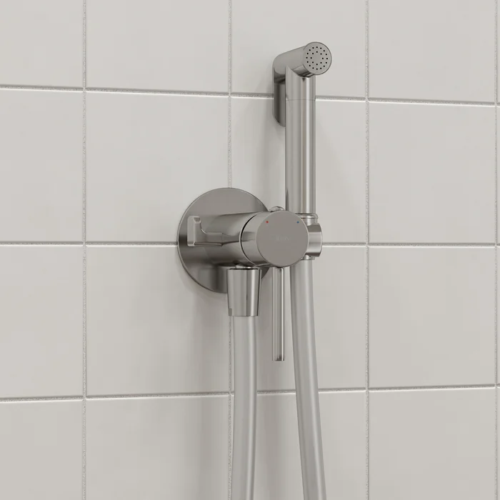 Смеситель для душа с гигиеническим душем Axes в стильном оттенке матового хрома – практичный и стильный, его дизайн сочетает в себе трендовый минимализм форм и четкие грани. Имеет крючок для полотенца, который можно установить как слева, так и справа. Гладкий душевой шланг 1,2 м в комплекте.