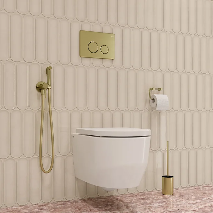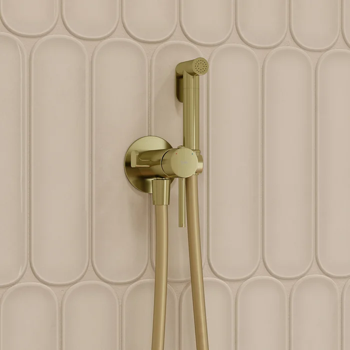Смеситель для душа с гигиеническим душем Axes в красивом оттенке матового золота – практичный и стильный, его дизайн сочетает в себе трендовый минимализм форм и четкие грани. Имеет крючок для полотенца, который можно установить как слева, так и справа. Гладкий душевой шланг 1,2 м в комплекте.