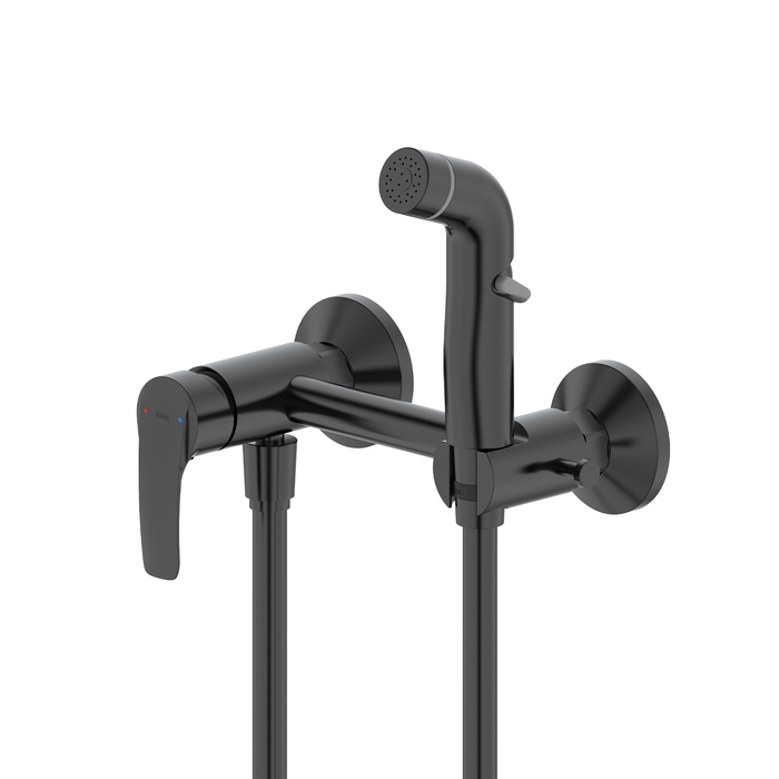 Смеситель с гигиеническим душем Ray наружного монтажа на два отверстия в трендовом черном цвете – универсальный практичный дизайн, который подойдет для разных интерьеров в современном стиле. В комплекте однорежимная лейка и душевой шланг из ПВХ (1,2 м) с двумя коническими гайками. Крючок для полотенца справа от лейки.