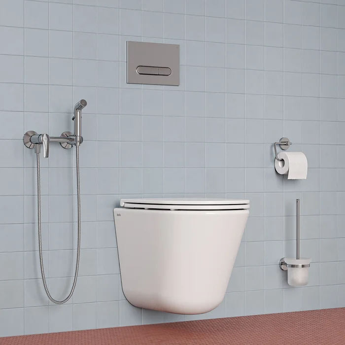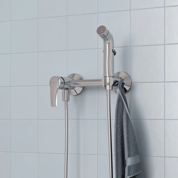 Смеситель с гигиеническим душем Ray наружного монтажа на два отверстия в классическом хроме – универсальный практичный дизайн, который подойдет для разных интерьеров в современном стиле. В комплекте однорежимная лейка и душевой шланг в оплетке из нержавеющей стали (1,2 м) с двумя коническими гайками. Крючок для полотенца справа от лейки.
