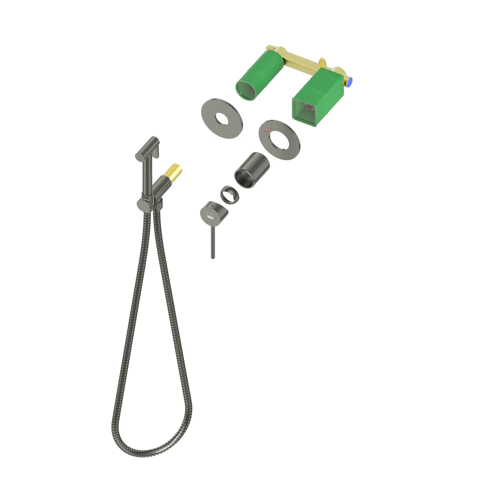 Встраиваемый блок управления смесителем - 1 шт., Картридж смесителя с защитой от ожогов - 1 шт., Защитная крышка картриджа - 1 шт., Защитная пробка с резьбой - 1 шт., Декоративные накладки - 2 шт., Декоративная гильза - 1 шт., Соединительная трубка - 1 шт., Держатель лейки с подключением шланга (латунный) - 1 шт., Декоративная крышка картриджа - 1 шт., Ручка управления смесителем - 1 шт., Гигиеническая лейка (латунная) - 1 шт., Шланг душа 1,2 м (латунный) - 1 шт., Инструкция - 1 шт.