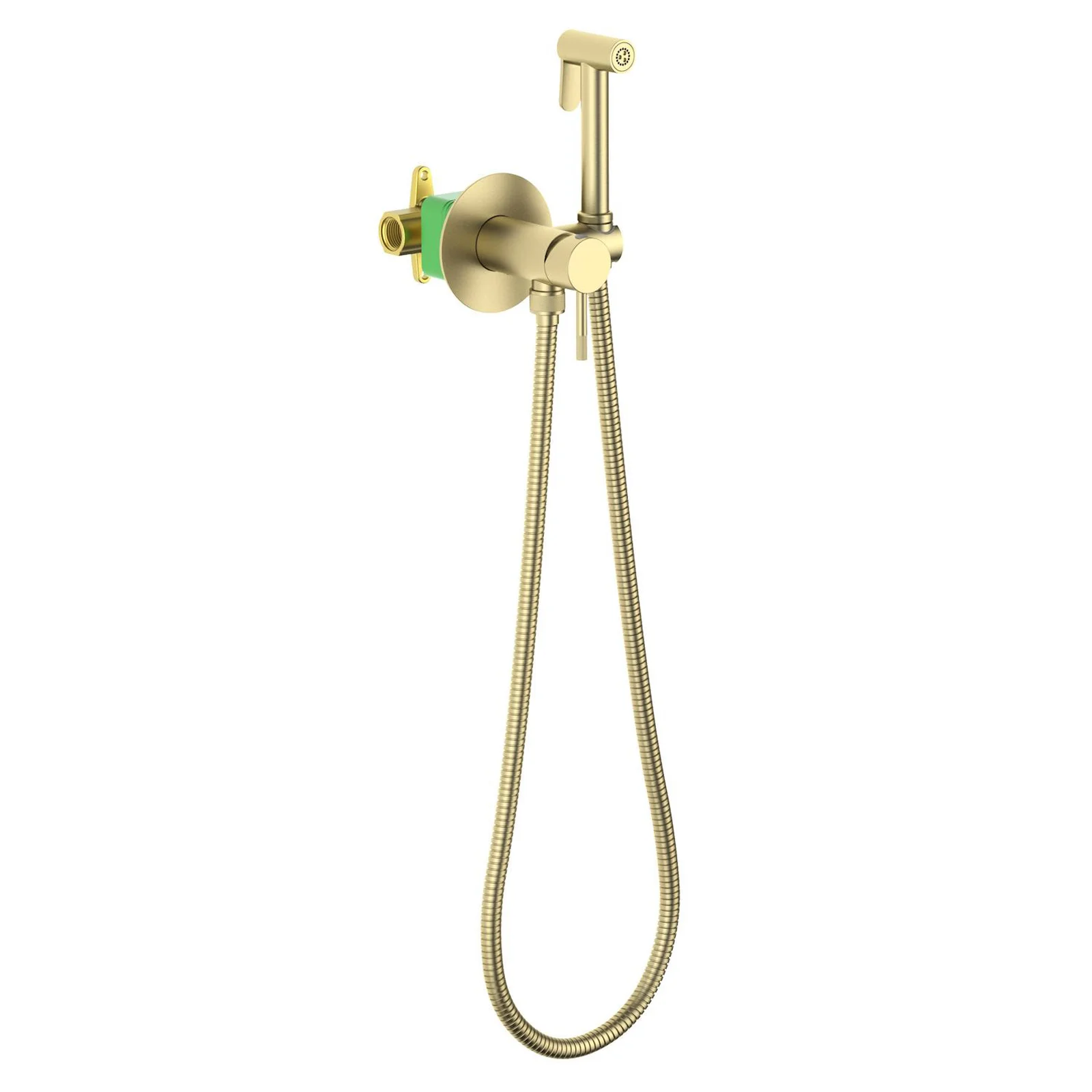 Смеситель скрытого монтажа с подключением шланга гигиенического душа - 1 шт., Декоративная накладка смесителя (латунная) - 1 шт., Ручка управления смесителем - 1 шт., Шланг душа (латунный) 1,2 м - 1 шт., Гигиеническая лейка (латунная) - 1 шт., Инструкция - 1 шт.