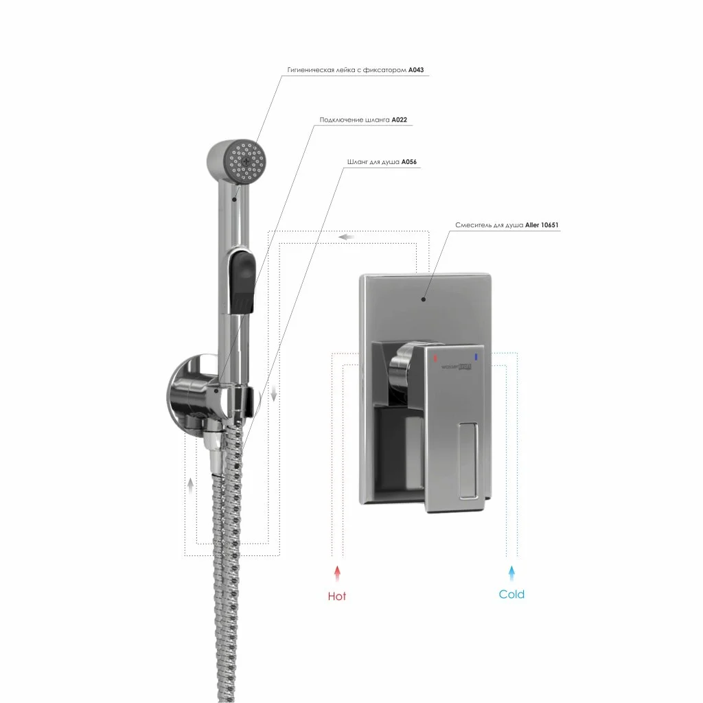 Смеситель для душа Aller 10651, Подключение шланга A022, Шланг для душа 1000 мм А056, Гигиеническая лейка с фиксатором A043