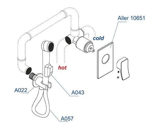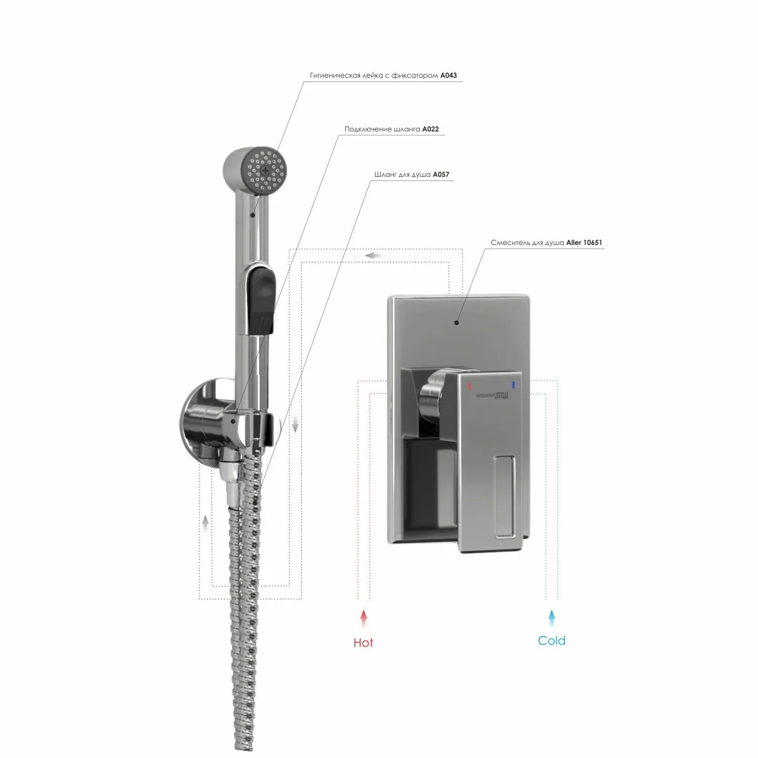 Смеситель для душа Aller 10651, Подключение шланга A022, Шланг для душа 1200 мм А057, Гигиеническая лейка с фиксатором A043