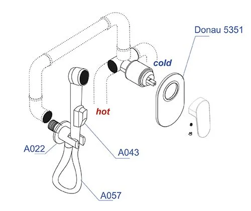Смеситель для душа Donau 5351, Подключение шланга A022, Шланг для душа 1200 мм А057, Гигиеническая лейка с фиксатором A043
