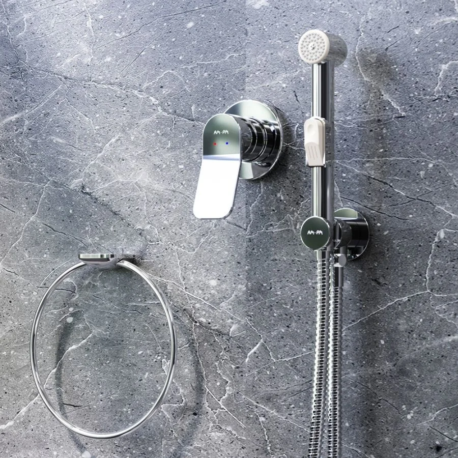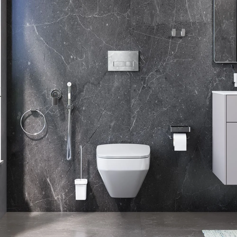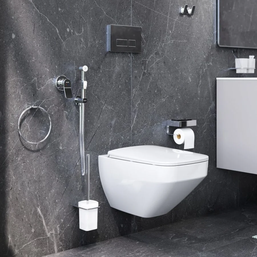Комплект включает в себя: стильный смеситель для душа монтируемый в стену шланговое присоединение с боковым расположением держателя для гигиенической лейки гигиеническая лейка душевой шланг 1 500 мм.