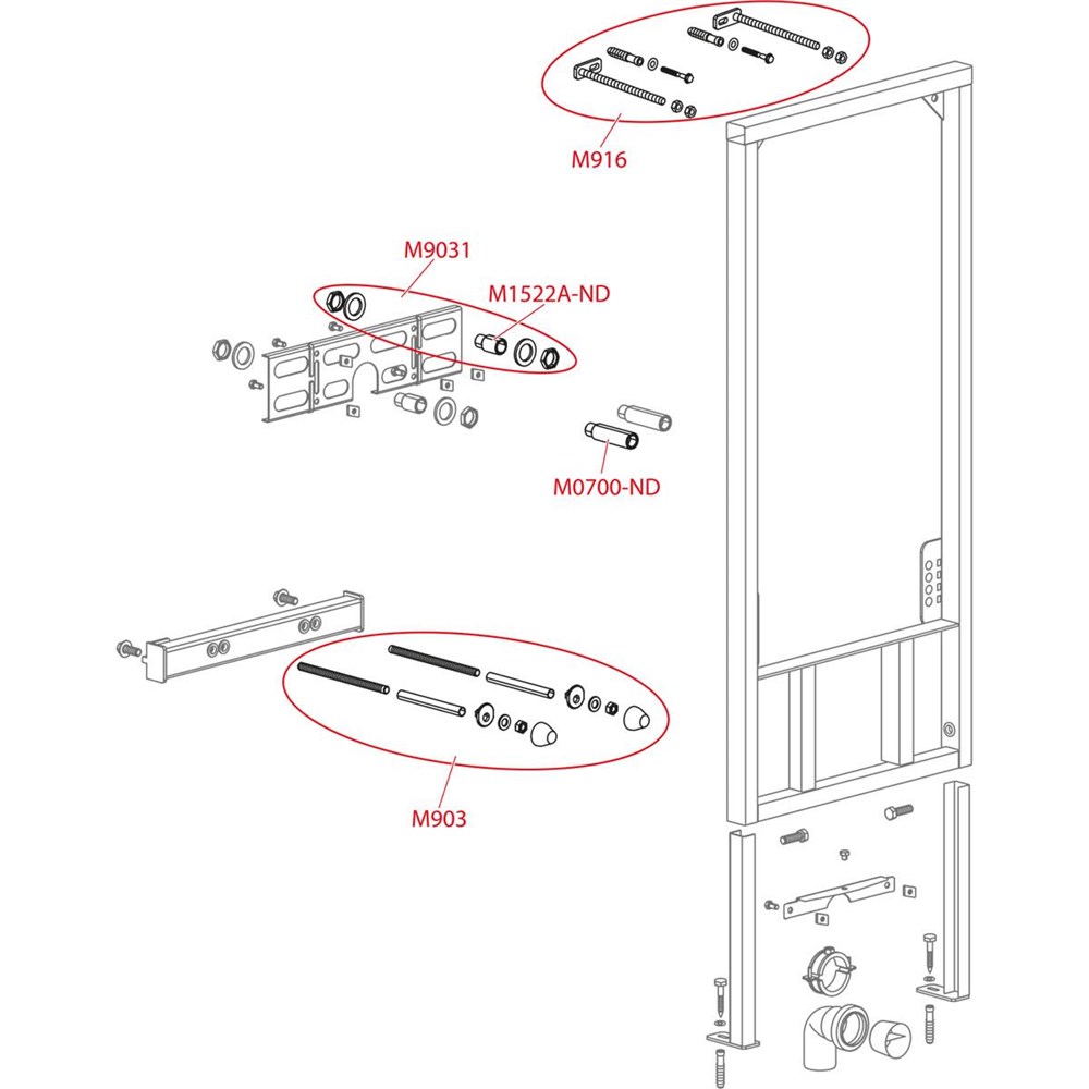 Самонесущая рама . Монтажный комплект: винт ?8?60 – 4 шт., дюбель ?12 – 4 шт. . Монтажный комплект для крепления биде: шпилька М12 – 2 шт., шайба – 4 шт., колпачок – 2 шт., гайка – 2 шт., гофрированный рукав – 2 шт. . Резьбовое соединение для подключения