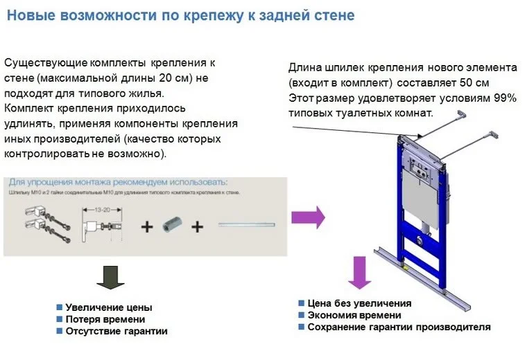 В комплект поставки входит звукоизолирующая прокладка (156.050.00.1), специальная верхняя планка, удлиненные шпильки крепления инсталляции к стене (50см), набор для подсоединения к канализации.