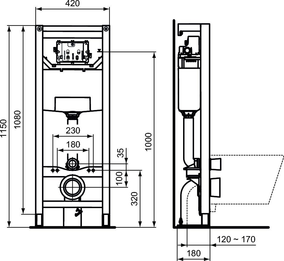 PROSYS 120 P Встраиваемая инсталляция для монтажа подвесных унитазов. Несущая рама, для монтажа с гипсокартонной стеной. По 2 крепежные точки на ногах. Рама тестирована нагрузкой 400 кг; устойчива к коррозии и царапинам. Легкая и быстрая установка при помощи системы EasyFix system. Сливной патрубок регулируется по глубине. Регулируемая высота от 0 до 200 мм. Минимальная толщина 180 мм. Встраиваемый бачок с фронтальным пневматическим управлением. Двойной смыв, пред-установка 6/3 л. Три варианта объема смыва с возможностью быстрой регулировки - 4/2, 6/3 или 7/3 л. Полипропиленовый бачок, устойчивый к термальным перепадам; прокладка против конденсата в комплекте. Технология SmartValve позволяет экономить до 9 л воды в день; маркировка CE EN 14055 CL1; тихий клапан, соответствующий стандарту NF, категория Class I; толщина бачка 120 мм. Аксессуары в комплекте: крепеж для унитаза, крепежи для рамы, подсоединения входящей и сливной труб, сливной патрубок (колено) с адаптором O90/110 мм, резиновая прокладка для унита