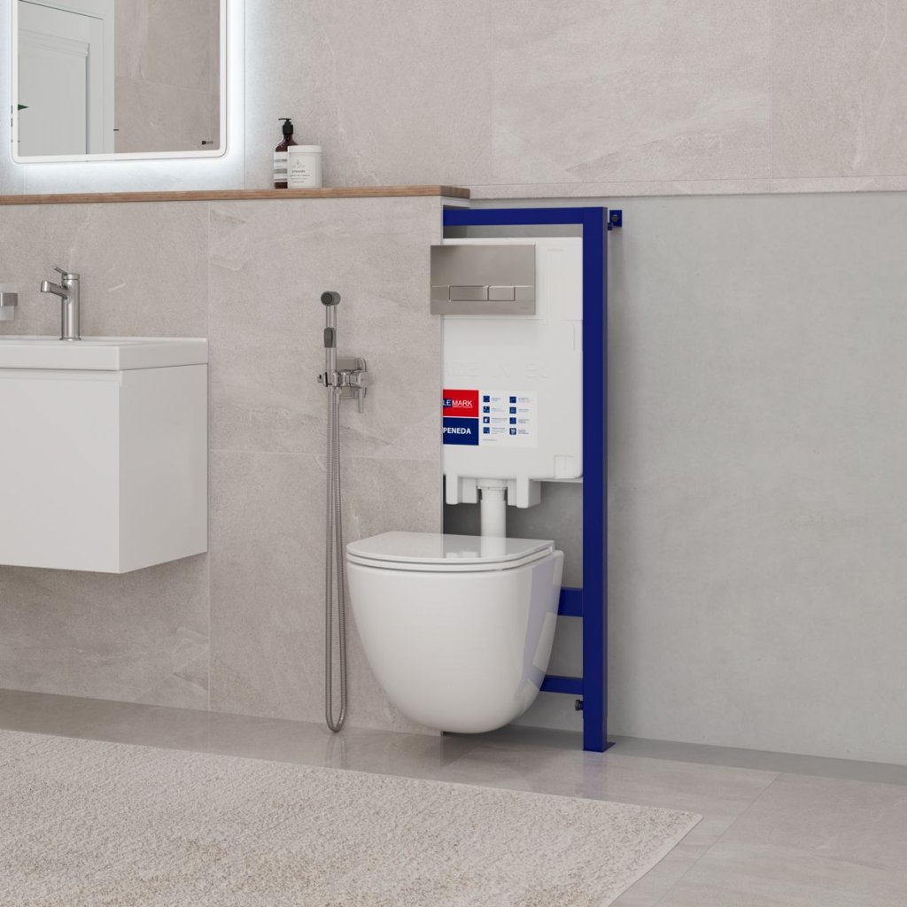 Инсталляция для унитаза на монтажной раме, Бачок скрытого монтажа с запорным вентилем, Комплект креплений, патрубков для подключения к унитазу, шпильки, Фановый отвод для канализации, Инструкция, ВНИМАНИЕ! Клавиша смыва В КОМПЛЕКТ НЕ ВХОДИТ.