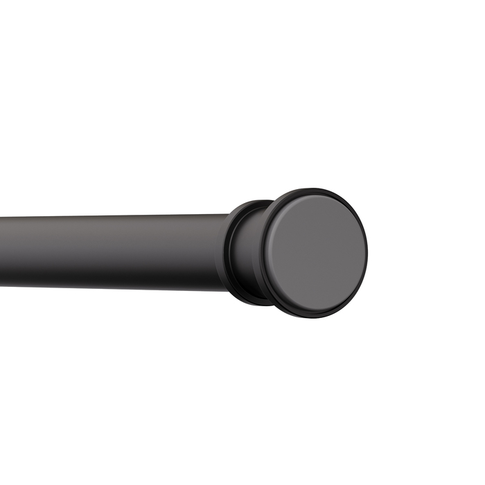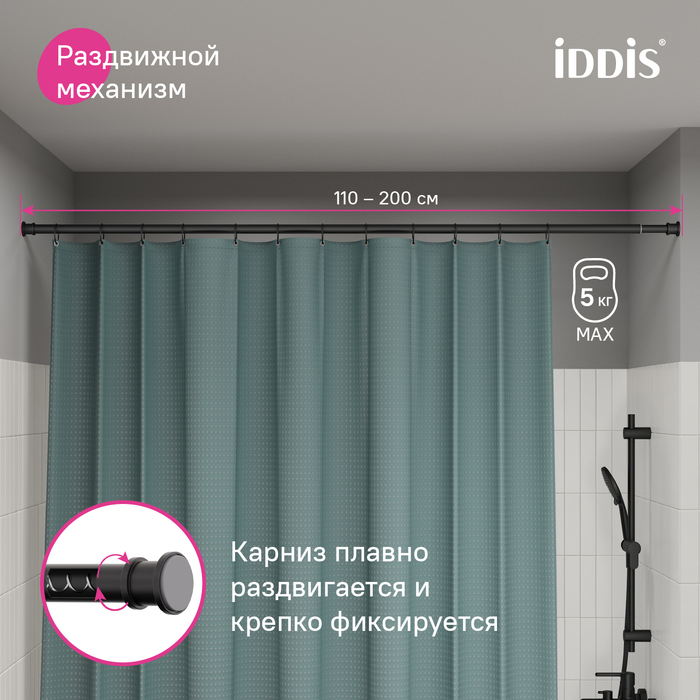 Карниз для шторы в ванную комнату в черном цвете регулируется по длине от 110 до 200 см. Благодаря телескопической конструкции подходит для ванн разных размеров. Прост в установке, не требует сверления и использования дополнительных инструментов. Карниз плавно раздвигается и крепко фиксируется враспор за счет пружинного механизма. Длина регулируется путем его закручивания в ту или иную сторону.