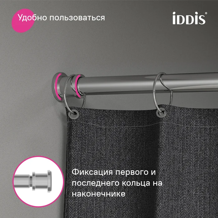 • Карниз оснащен пластиковыми наконечниками с полиуретановыми прокладками, за счет которых не поцарапает стены в ванной и надежно зафиксируется между ними. Съемные наконечники карниза позволяют при желании сначала повесить штору, а затем установить карниз.