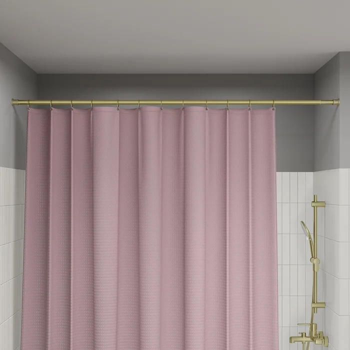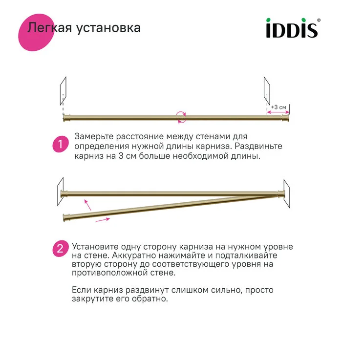 Карниз для шторы в ванную комнату в золотом цвете регулируется по длине от 110 до 200 см. Благодаря телескопической конструкции подходит для ванн разных размеров. Прост в установке, не требует сверления и использования дополнительных инструментов. Карниз плавно раздвигается и крепко фиксируется враспор за счет пружинного механизма. Длина регулируется путем его закручивания в ту или иную сторону.