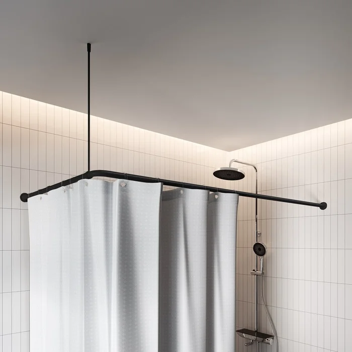 Угловой карниз для шторы в ванную комнату черного цвета.