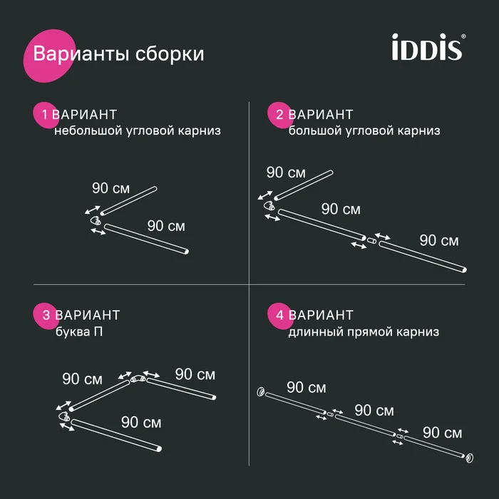 - Карниз состоит из трех трубок длиной 90 см; в комплекте идут 2 прямых и 2 угловых переходника-соединителя. Это позволяет собрать карниз 4 способами: в виде небольшого углового карниза (90 и 90 см), в виде большого углового карниза (90+90 и 90 см), буквой П и в виде длинного карниза 270 см (90+90+90 см).