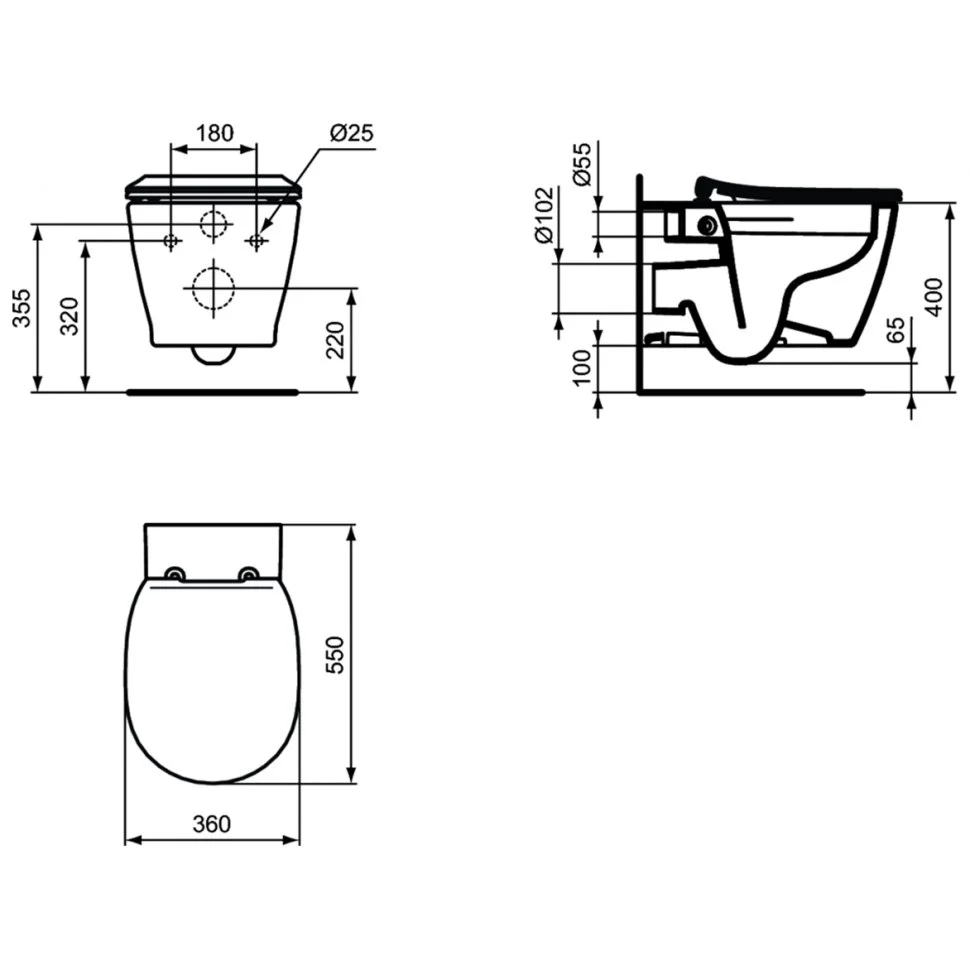 Промо-комплект, состоящий из: E822301 CONNECT Rimless Безободковый Унитаз подвесной, глубокий смыв, с сидением и крышкой с функцией плавного закрытия E772401, без крепежа. Инновационная технология смыва Rimless обеспечивает идеальное качество смыв.Отсутствует нависающий обод, благодаря чему вода поступает с верхней точки чаши, обеспечивая 100% чистый смыв по всей поверхности