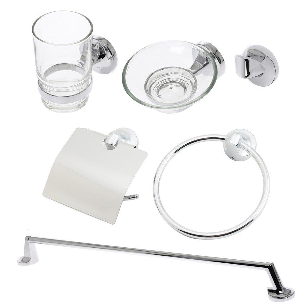 Комплект аксессуаров Orange украсит интерьер ванной комнаты в едином стиле. В комплекте все необходимое: кольцо для полотенец, вешалка для полотенец, крючок, мыльница, стакан для зубных щеток, держатель для туалетной бумаги и набор креплений. Материал цинк и прозрачное стекло, монтаж подвесной, цвет глянцевый хром.