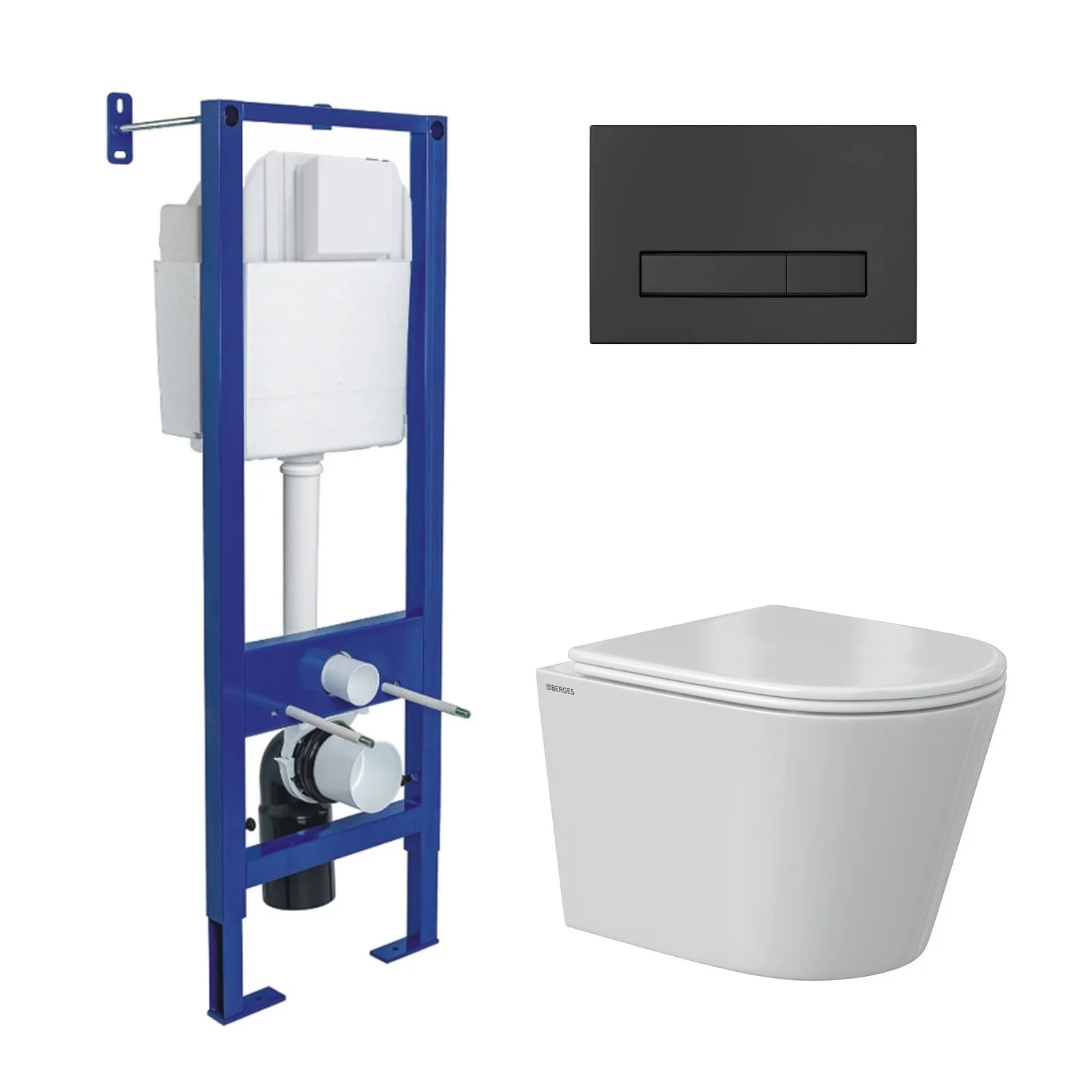 Комплект инсталляции BERGES АТОМ 410 с клавишей смыва Atom Line черная Soft Touch, унитазом VITA Rimless 49 см и сиденьем микролифт, быстросъём 043382