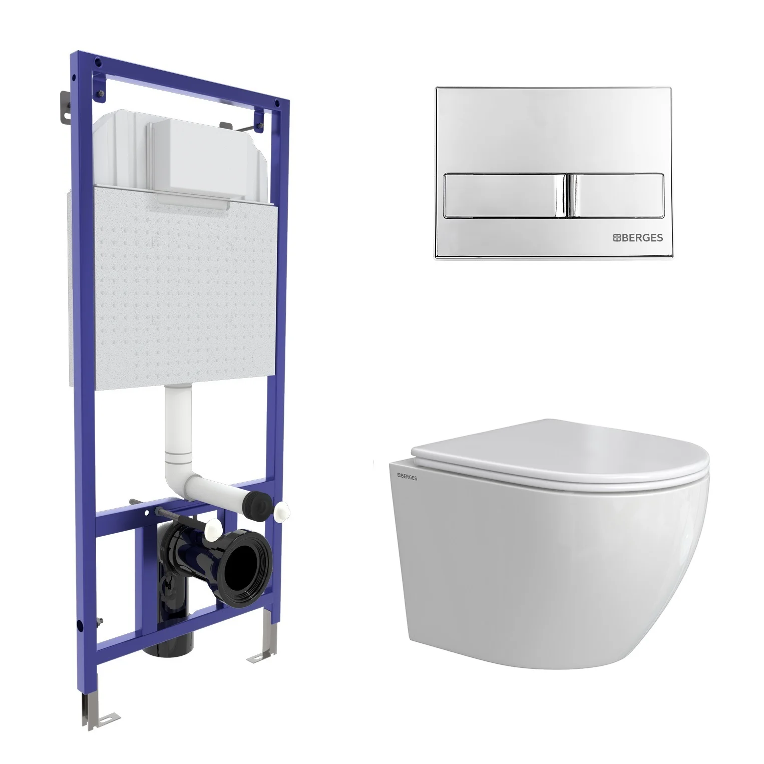 Комплект инсталляции BERGES NOVUM с клавишей смыва L3 хром глянец, унитазом OKUS Rimless 49 см и сиденьем микролифт, быстросъём 043386