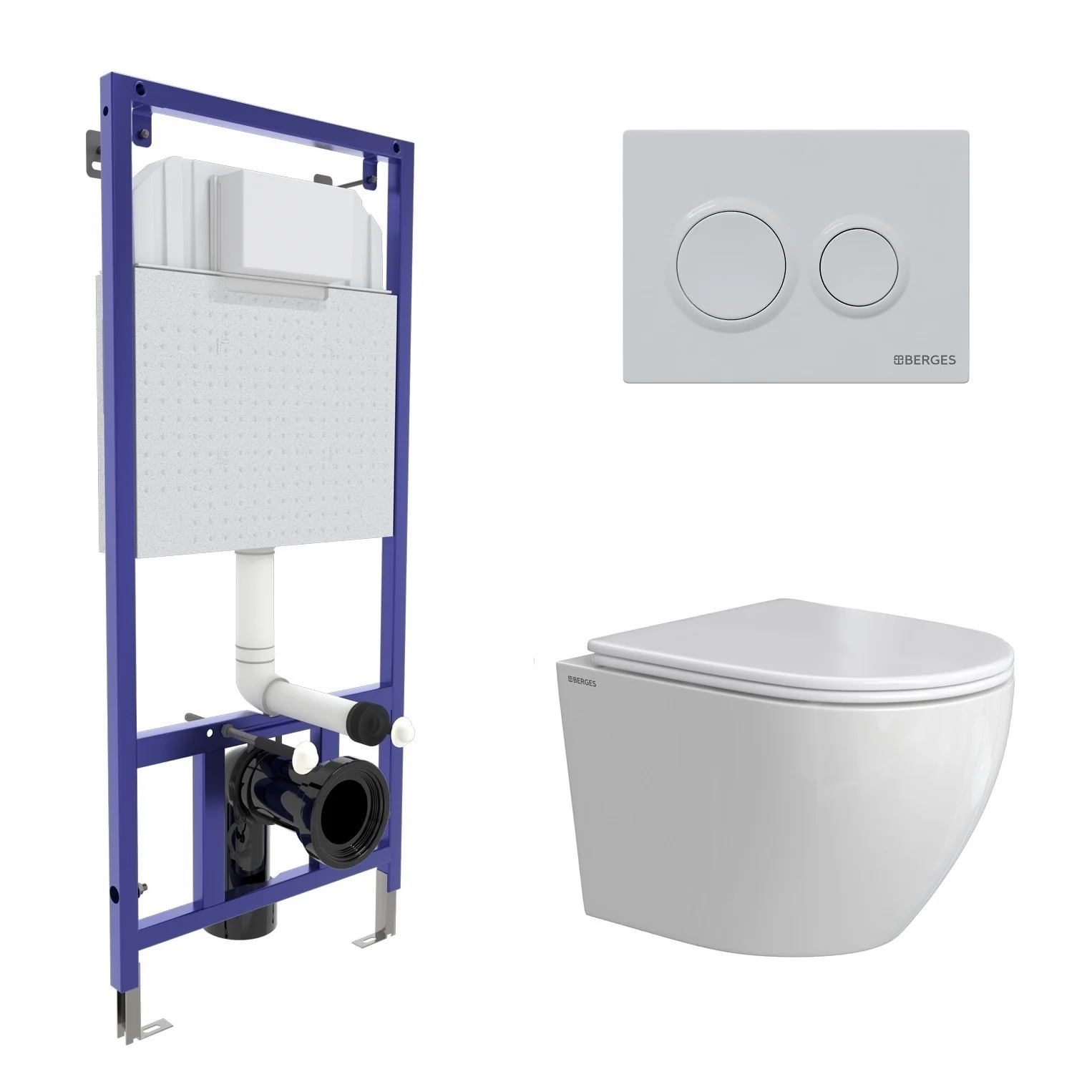 Комплект инсталляции BERGES NOVUM с клавишей смыва O1 белая, унитазом OKUS Rimless 49 см и сиденьем микролифт, быстросъём 043391