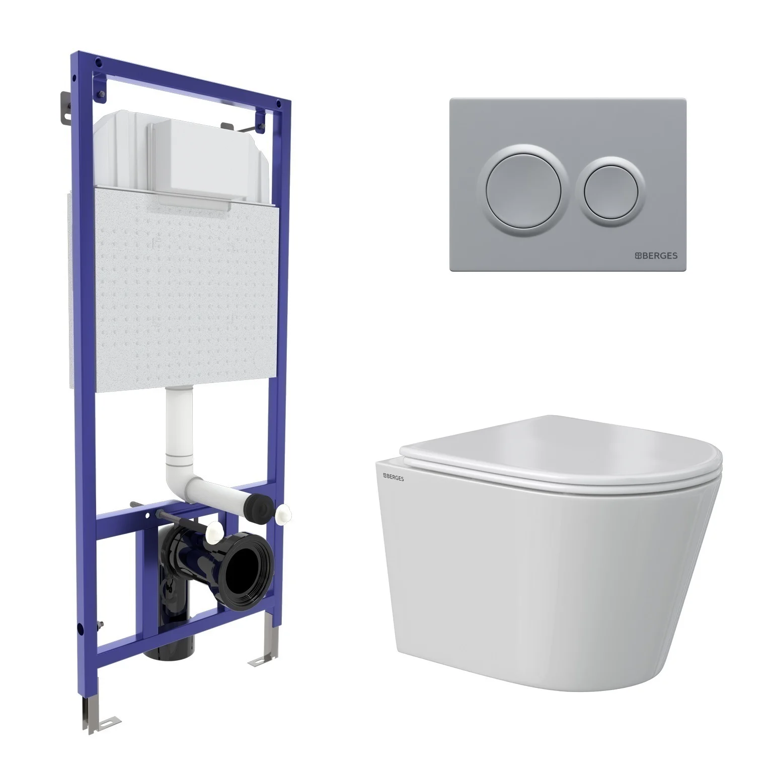 Комплект инсталляции BERGES NOVUM с клавишей смыва O2 матовый хром, унитазом VITA Rimless 49 см и сиденьем микролифт, быстросъём 043380