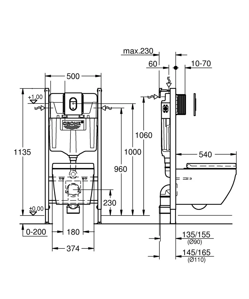 Комплект инсталляции GROHE Solido 5 в 1: инсталляция без перекладины (2 ч.), Унитаз подвесной Euro C 39535000
