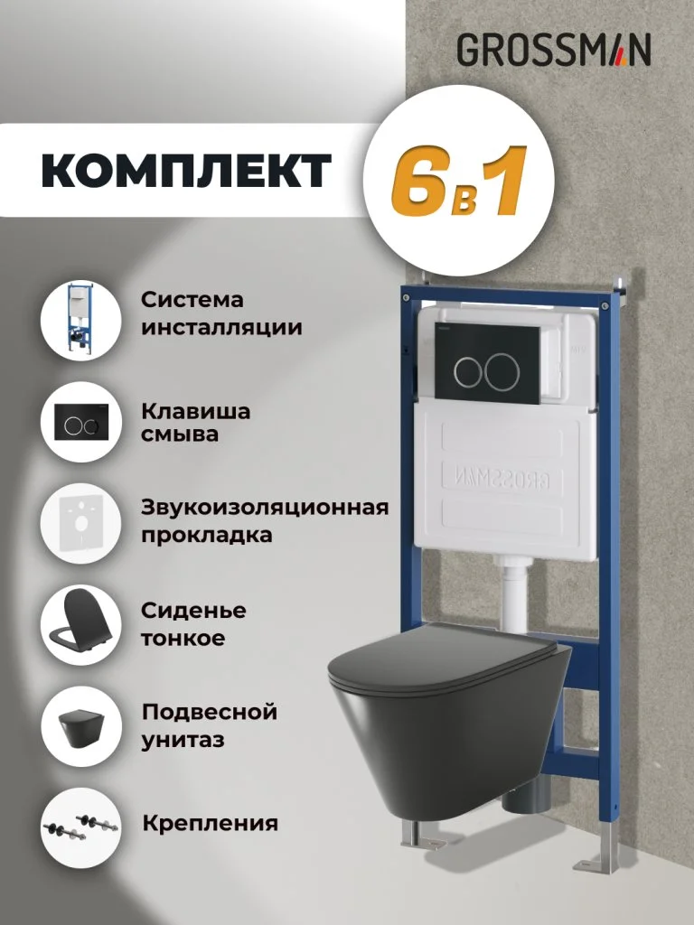 Комплект инсталляции GROSSMAN 900.K31.01.000 с клавишей смыва 700.K31.01.210.210 черный матовый и унитазом GROSSMAN GR-4477BMS арт.97.4477BMS.01.210