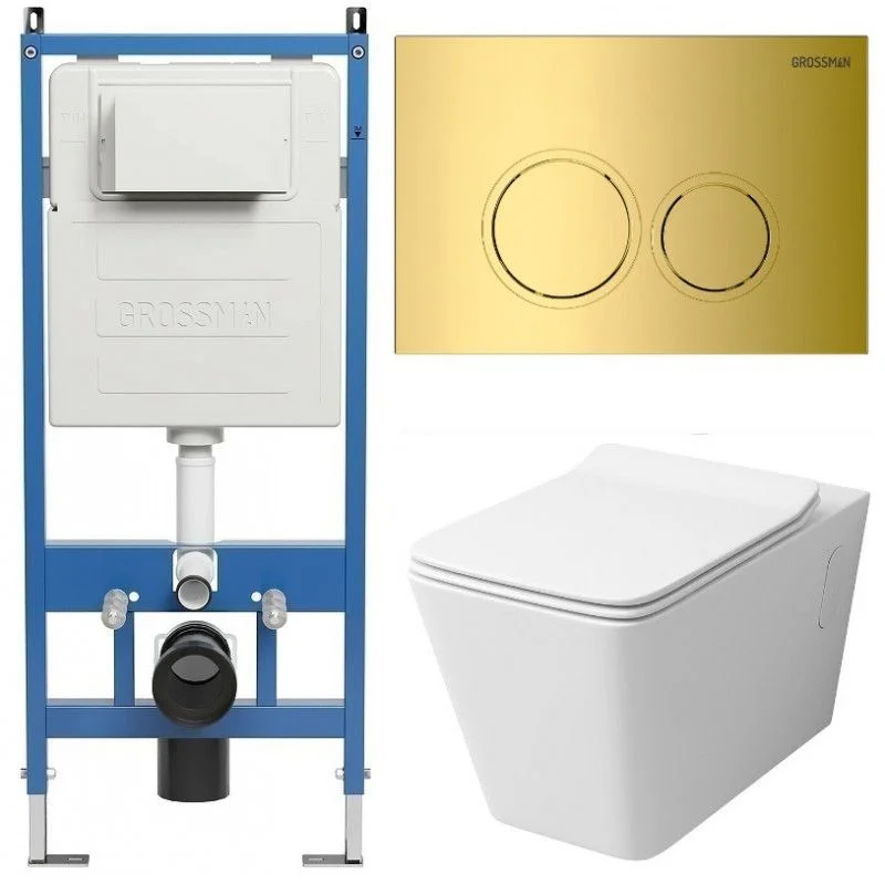 Комплект инсталляции GROSSMAN 900.K31.01.000 с клавишей смыва 700.K31.01.300.300 золото и унитазом GROSSMAN GR-4414S арт.97.4414S.01.300