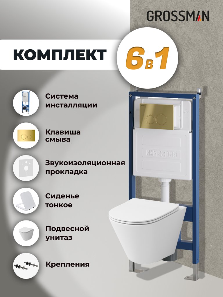 Комплект инсталляции GROSSMAN 900.K31.01.000 с клавишей смыва 700.K31.01.300.300 золото и унитазом GROSSMAN GR-4477S арт.97.4477S.01.300