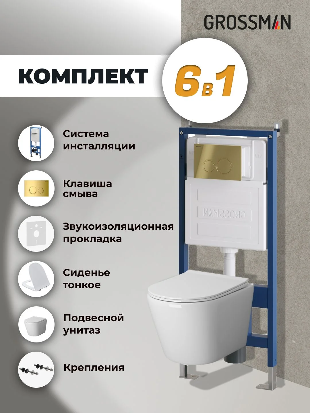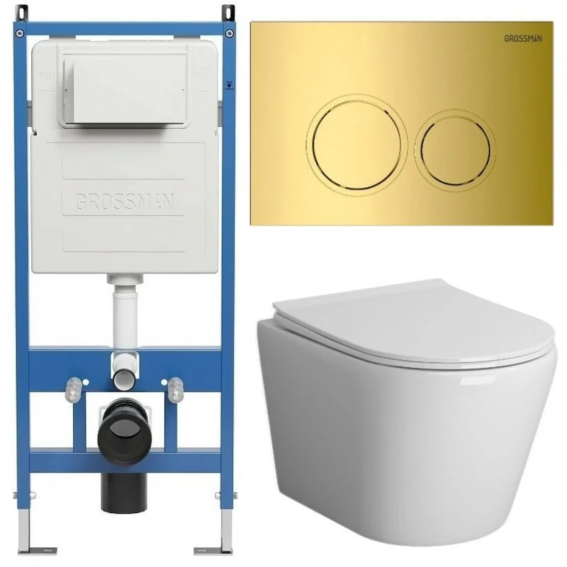 Комплект инсталляции GROSSMAN 900.K31.01.000 с клавишей смыва 700.K31.01.300.300 золото и унитазом GROSSMAN GR-4478S арт.97.4478S.01.300