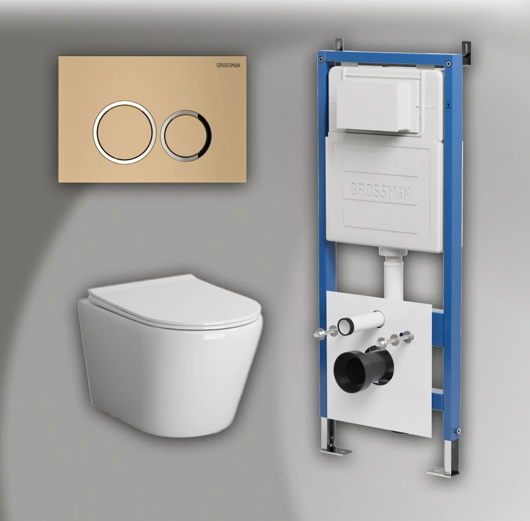 Комплект инсталляции GROSSMAN 900.K31.01.000 с клавишей смыва 700.K31.01.310.310 золото матовое и унитазом GROSSMAN GR-4478SQ арт.97.4478SQ.01.310