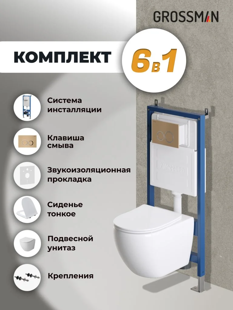 Комплект инсталляции GROSSMAN 900.K31.01.000 с клавишей смыва 700.K31.01.310.310 золото матовое и унитазом GROSSMAN GR-4411SQ арт.97.4411SQ.01.310