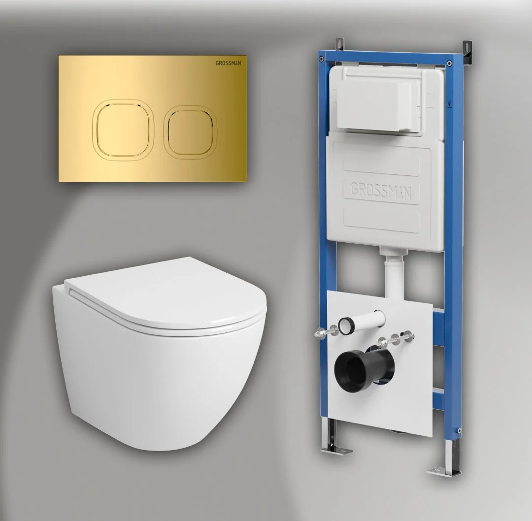 Комплект инсталляции GROSSMAN 900.K31.01.000 с клавишей смыва 700.K31.02.300.300 золото и унитазом GROSSMAN GR-4455SQ арт.97.4455SQ.02.300