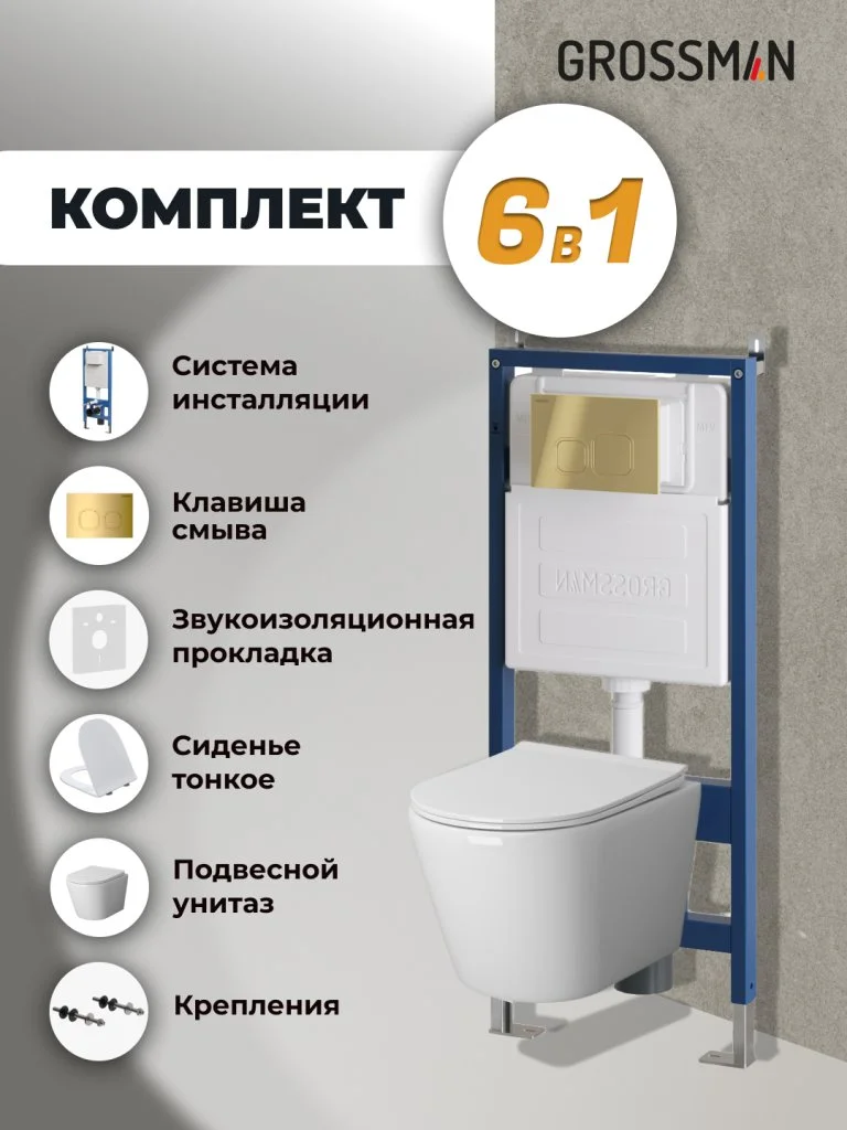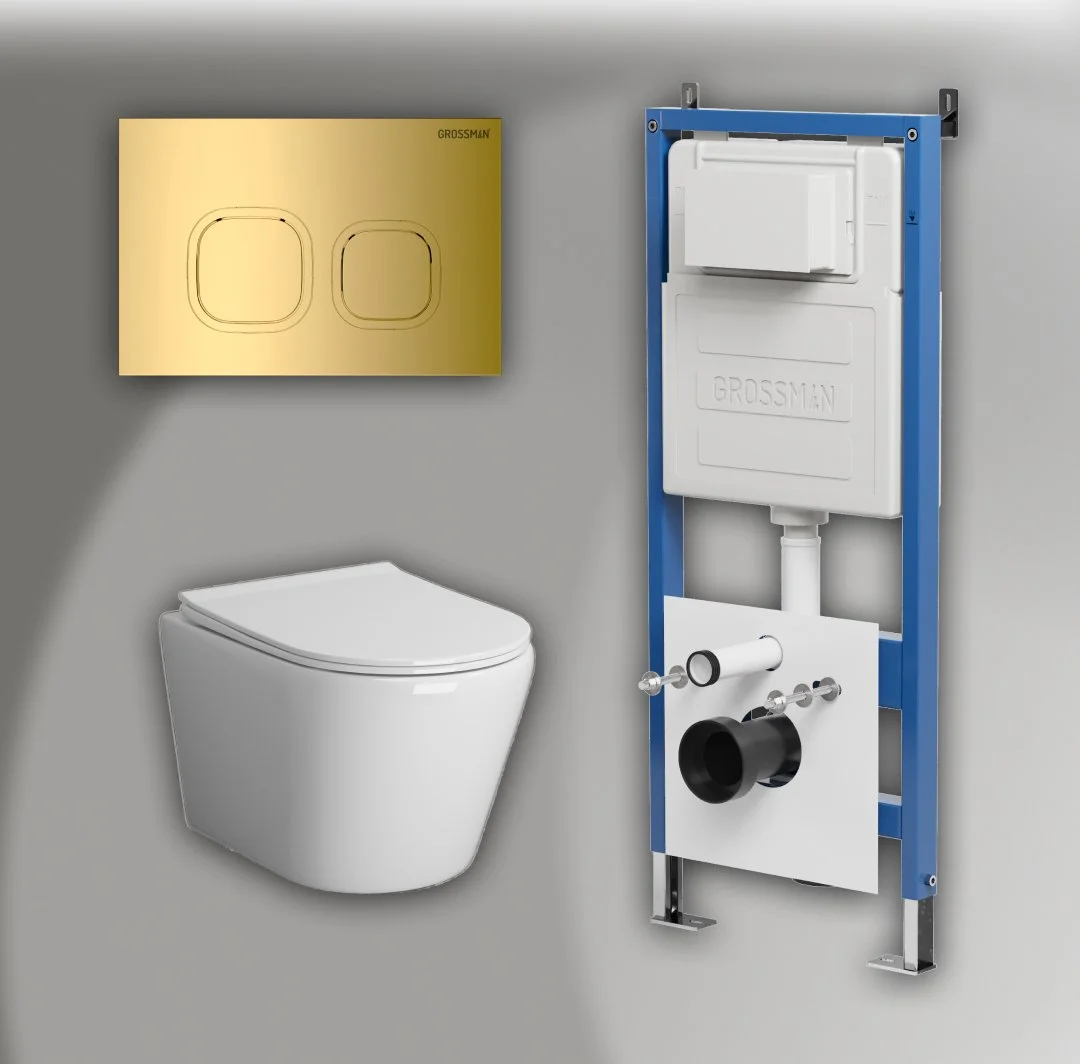 Комплект инсталляции GROSSMAN 900.K31.01.000 с клавишей смыва 700.K31.02.300.300 золото и унитазом GROSSMAN GR-4478S арт.97.4478S.02.300
