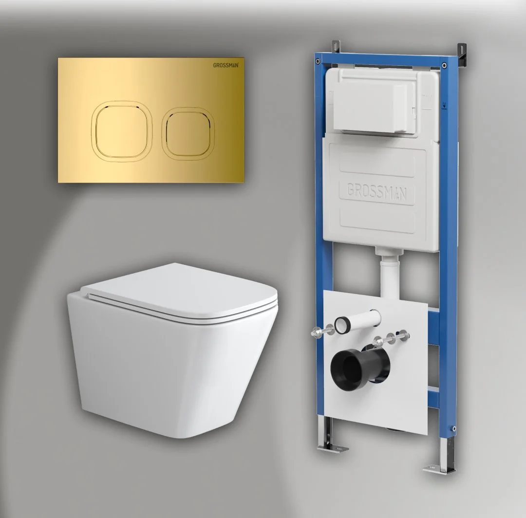 Комплект инсталляции GROSSMAN 900.K31.01.000 с клавишей смыва 700.K31.02.300.300 золото и унитазом GROSSMAN GR-4479SQ арт.97.4479SQ.02.300