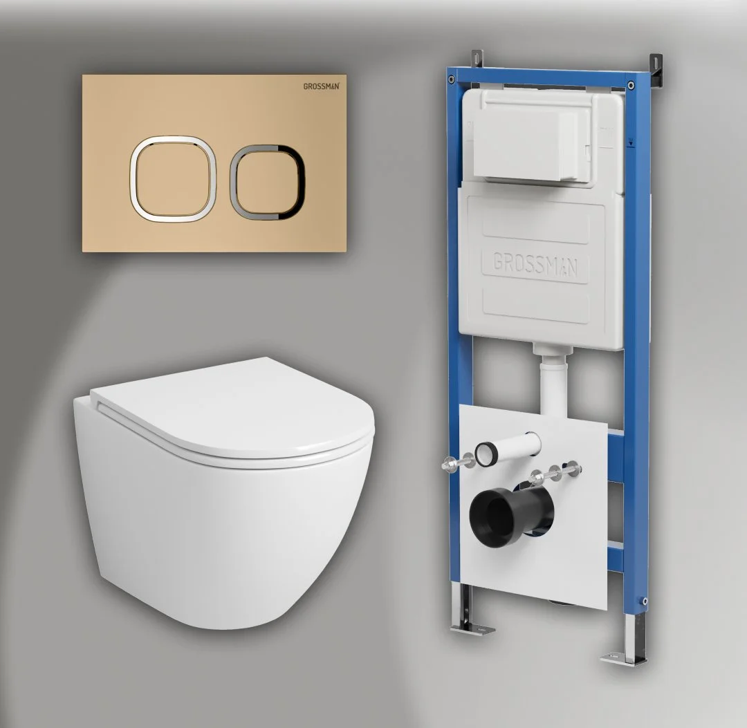 Комплект инсталляции GROSSMAN 900.K31.01.000 с клавишей смыва 700.K31.02.310.310 золото матовое и унитазом GROSSMAN GR-4411SQ арт.97.4411SQ.02.310