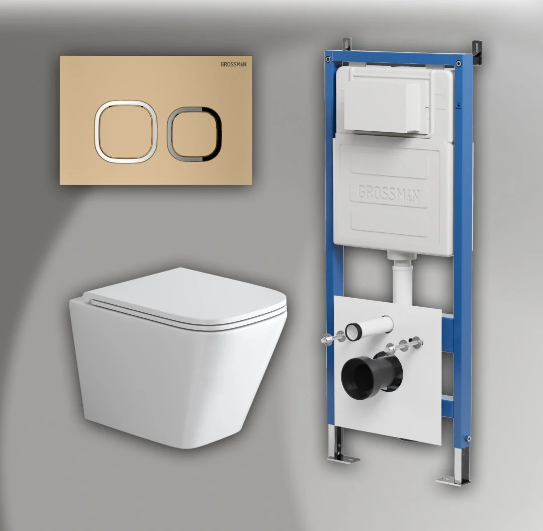 Комплект инсталляции GROSSMAN 900.K31.01.000 с клавишей смыва 700.K31.02.310.310 золото матовое и унитазом GROSSMAN GR-4479SQ арт.97.4479SQ.02.310