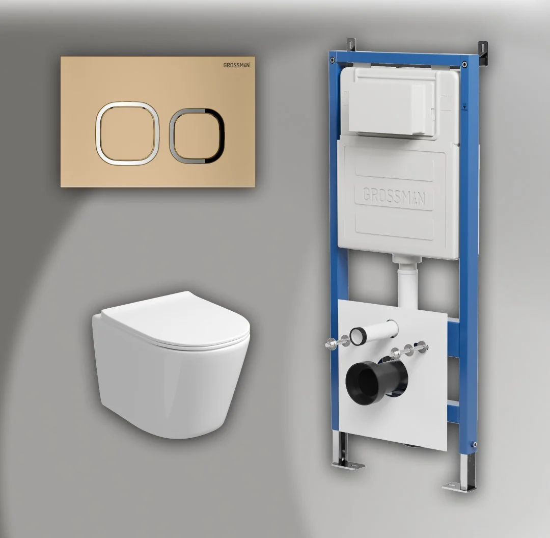 Комплект инсталляции GROSSMAN 900.K31.01.000 с клавишей смыва 700.K31.02.310.310 золото матовое и унитазом GROSSMAN GR-4477SQ арт.97.4477SQ.02.310