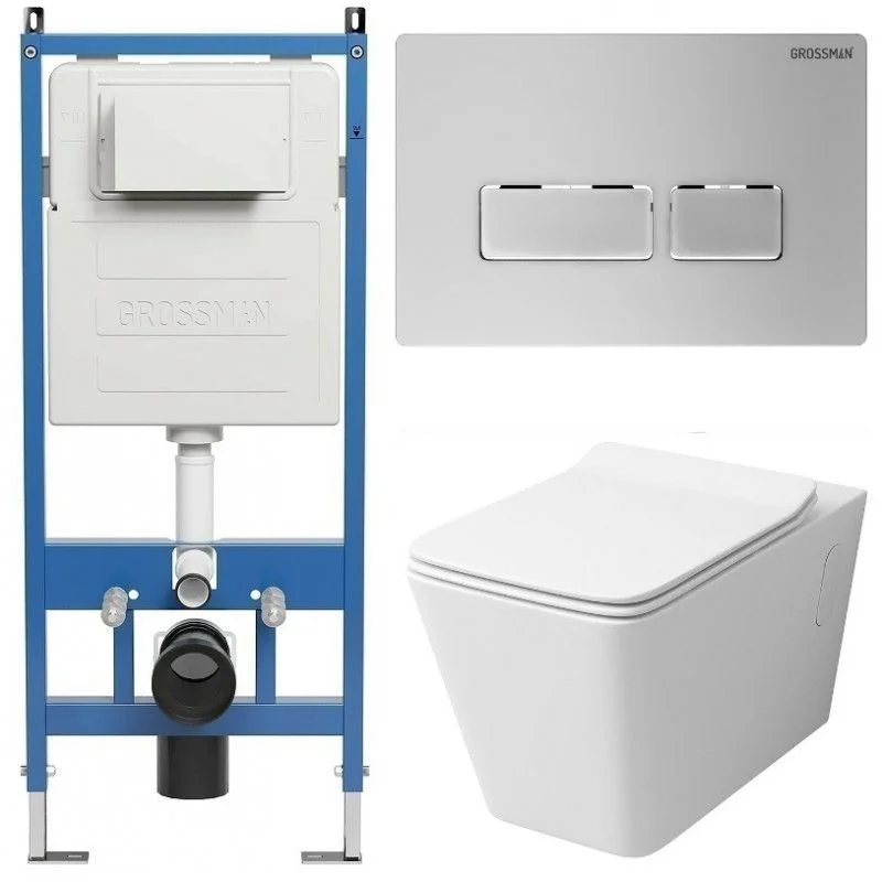 Комплект инсталляции GROSSMAN 900.K31.01.000 с клавишей смыва 700.K31.03.110.110 хром матовый и унитазом GROSSMAN GR-4414S арт.97.4414S.03.110